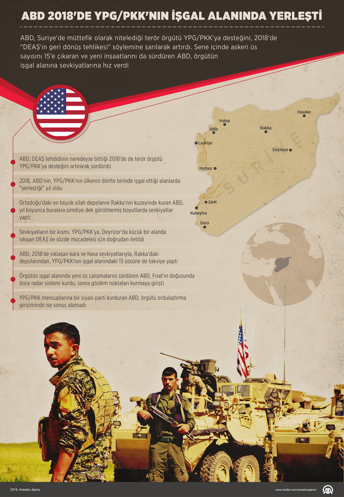 ABD, Suriye'de müttefik olarak nitelediği terör örgütü YPG/PKK'ya desteğini, 2018'de "DEAŞ'ın geri dönüş tehlikesi" söylemine sarılarak artırdı. Sene içinde askeri üs sayısını 15'e çıkaran ve yeni inşaatlarını da sürdüren ABD, örgütün işgal alanına sevkiyatlarına hız verdi. ( Muhammed Ali Yiğit - Anadolu Ajansı )19 Aralık 2018•Güncelleme: 19 Aralık 2018