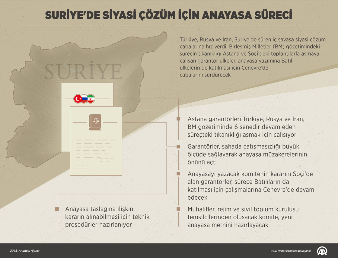 Türkiye, Rusya ve İran, Suriye'de süren iç savaşa siyasi çözüm çabalarına hız verdi. Birleşmiş Milletler (BM) gözetimindeki sürecin tıkanıklığı Astana ve Soçi'deki toplantılarla aşmaya çalışan garantör ülkeler, anayasa yazımına Batılı ülkelerin de katılması için Cenevre'de çabalarını sürdürecek.