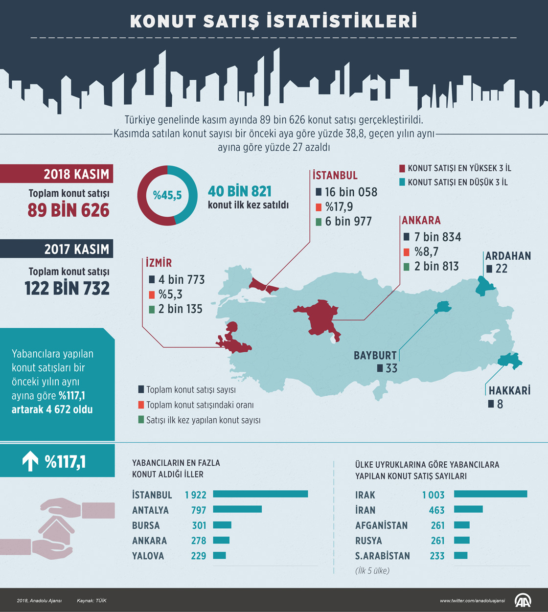 Türkiye genelinde kasım ayında 89 bin 626 konut satışı gerçekleştirildi. Kasımda satılan konut sayısı bir önceki aya göre yüzde 38,8, geçen yılın aynı ayına göre yüzde 27 azaldı. ( Kemal Delikmen - Anadolu Ajansı )