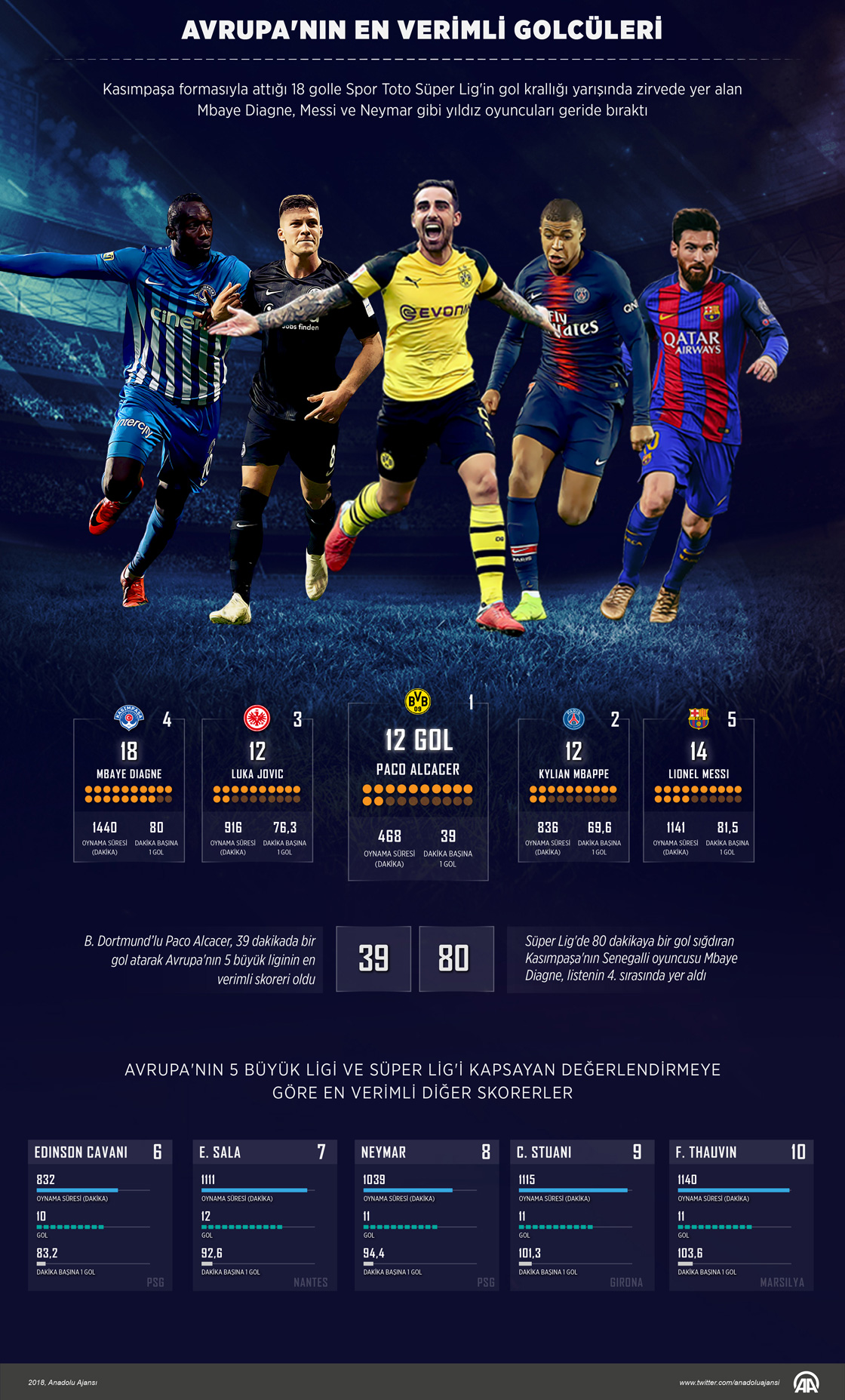 Borussia Dortmund'un İspanyol futbolcusu Paco Alcacer, 39 dakikada bir gol atarak Avrupa'nın 5 büyük liginin en verimli skoreri oldu. Valencia altyapısından yetişen 25 yaşındaki santrafor Alcacer, 2016 yazında transfer olduğu ancak fazla forma şansı verilmediği Barcelona'dan sonra gittiği Almanya'da kendini buldu. Kasımpaşa formasıyla attığı 18 golle Spor Toto Süper Lig'in gol krallığı yarışında zirvede yer alan Mbaye Diagne, yalnızca sayı değil verimlilik bakımından da Lionel Messi (14 gol), Edinson Cavani (10), Neymar (11) gibi yıldız oyuncuları geride bıraktı.