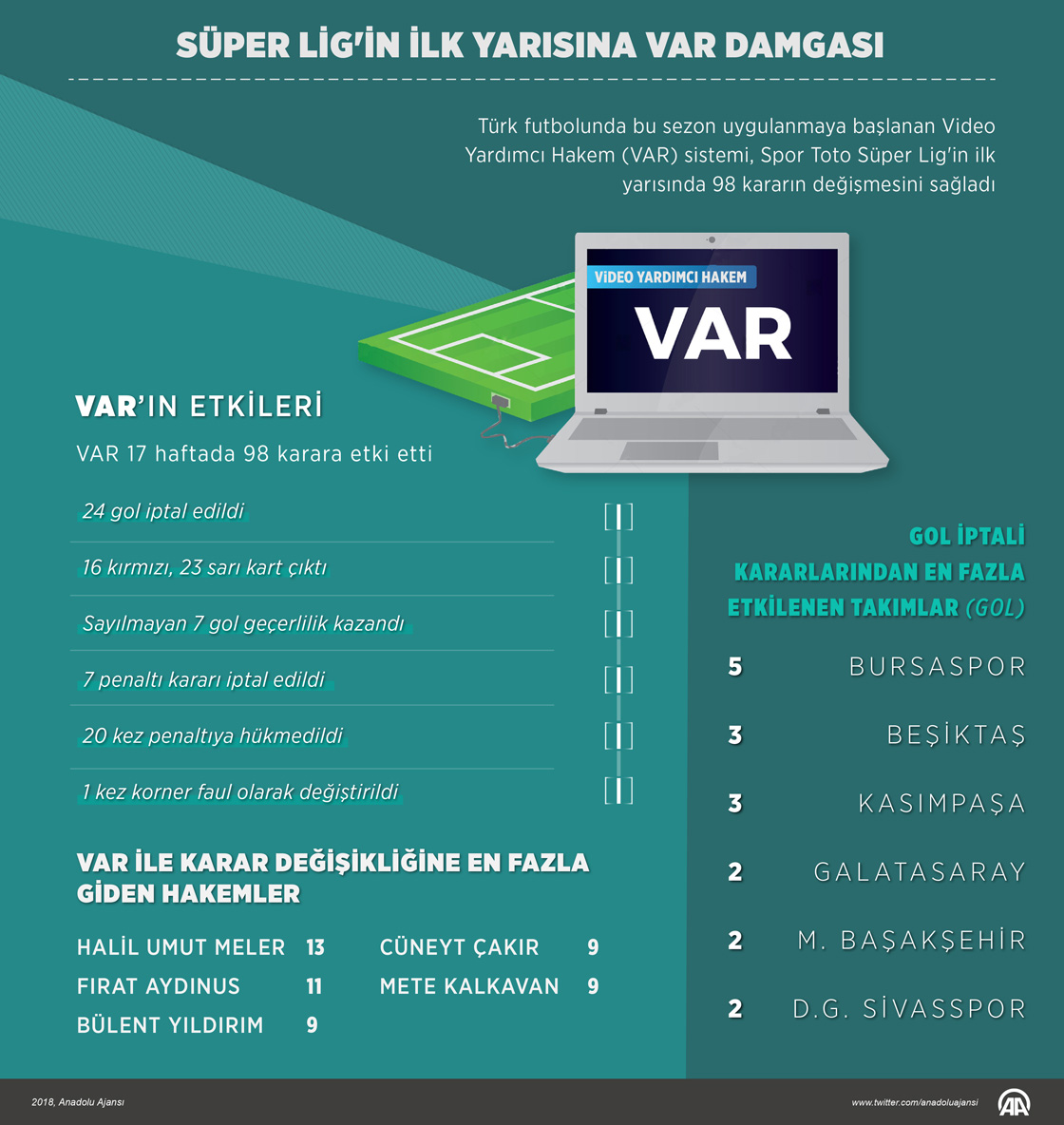 Türk futbolunda bu sezon uygulanmaya başlanan Video Yardımcı Hakem (VAR) sistemi, Spor Toto Süper Lig'in ilk yarısında 98 kararın değişmesini sağladı. ( Muhammed Ali Yiğit - Anadolu Ajansı )