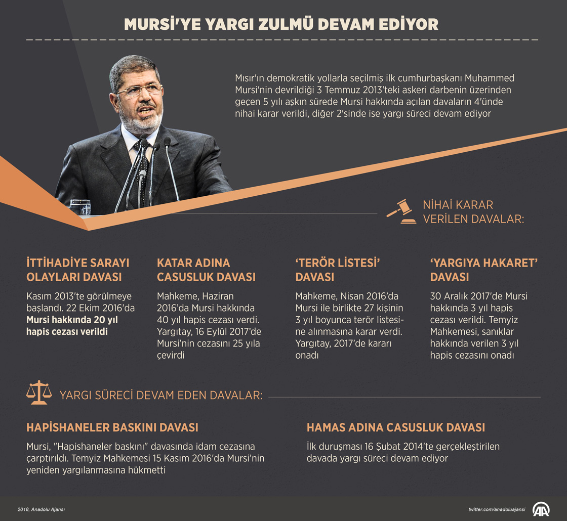 Mısır'ın demokratik yollarla seçilmiş ilk cumhurbaşkanı Muhammed Mursi'nin devrildiği 3 Temmuz 2013'teki askeri darbenin üzerinden geçen 5 yılı aşkın sürede Mursi hakkında açılan davaların 4'ünde nihai karar verildi, diğer 2'sinde ise yargı süreci devam ediyor. ( Murat Usubaliev - Anadolu Ajansı )25 Aralık 2018•Güncelleme: 25 Aralık 2018