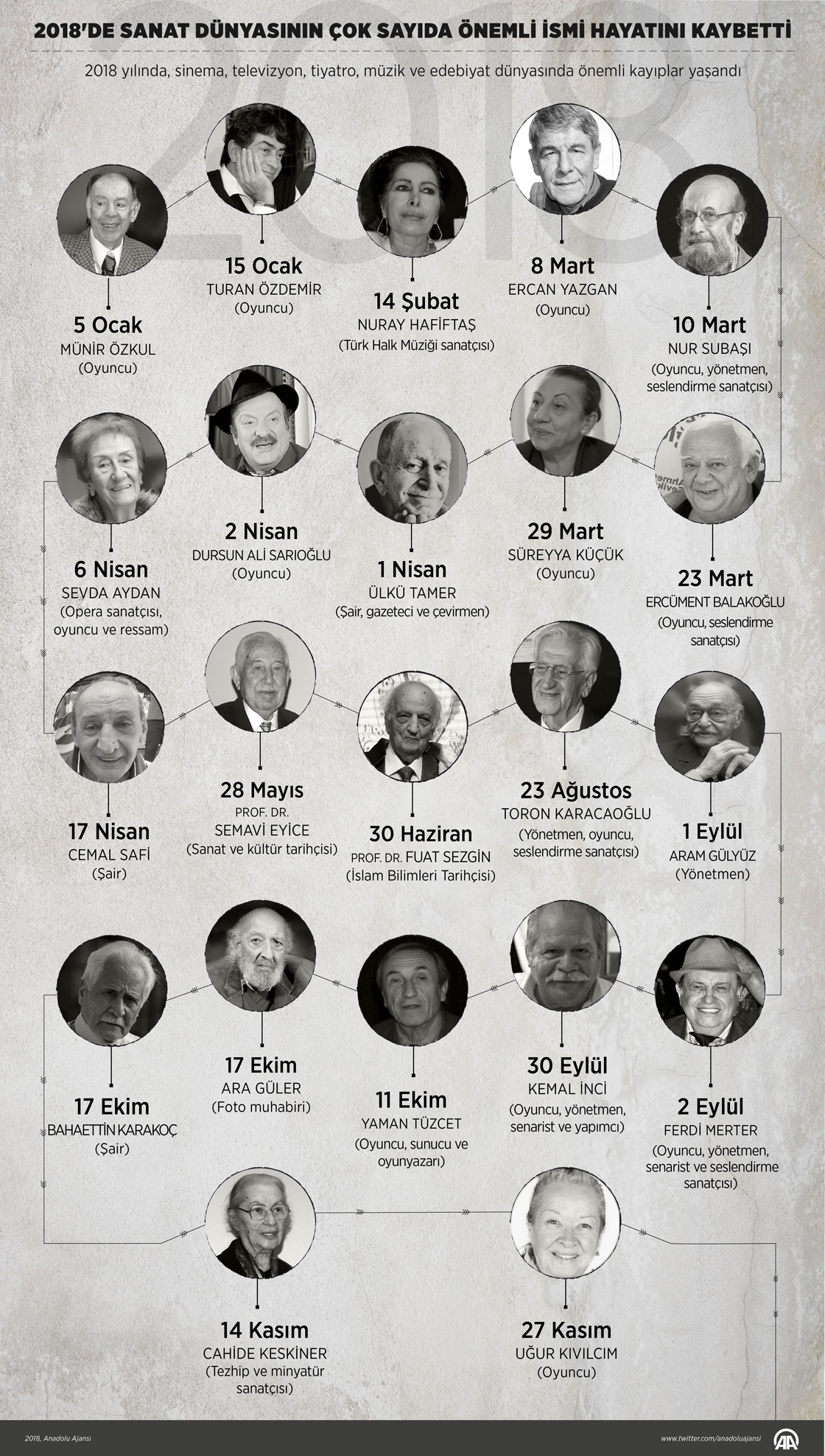 Münir Özkul, Nuray Hafiftaş, Prof. Dr. Semavi Eyice, Prof. Dr. Fuat Sezgin, Cemal Safi, Ara Güler, Aram Gülyüz, Burt Reynolds ile Aretha Franklin, 2018'de hayatını kaybeden ünlüler arasındaydı.