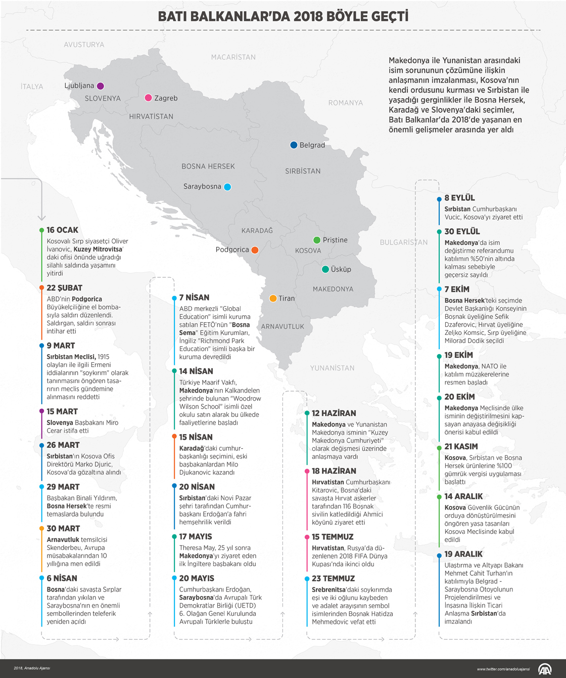 Makedonya ile Yunanistan arasındaki isim sorununun çözümüne ilişkin anlaşmanın imzalanması, Kosova'nın kendi ordusunu kurması ve Sırbistan ile yaşadığı gerginlikler ile Bosna Hersek, Karadağ ve Slovenya'daki seçimler, Batı Balkanlar'da 2018'de yaşanan en önemli gelişmeler arasında yer aldı. ( Murat Usubaliev - Anadolu Ajansı )25 Aralık 2018•Güncelleme: 25 Aralık 2018