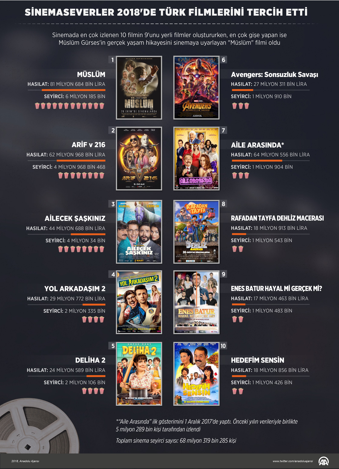 Sinemaseverler, 2018'de yerli filmlere yoğun ilgi gösterdi. En çok izlenen 10 filmin 9'unu yerli filmler oluştururken, en çok gişe yapan ise dram türünde olan ve Müslüm Gürses'in gerçek yaşam hikayesini sinemaya uyarlayan "Müslüm" filmi oldu. ( Kemal Delikmen - Anadolu Ajansı )26 Aralık 2018•Güncelleme: 26 Aralık 2018