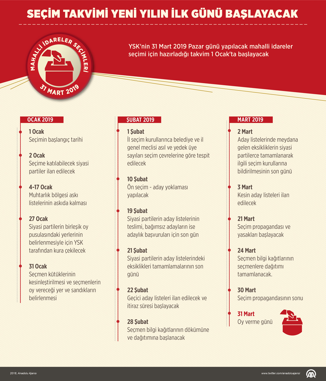 YSK'nin 31 Mart 2019 Pazar günü yapılacak mahalli idareler seçimi için hazırladığı takvim 1 Ocak'ta başlayacak. Seçim takvimine göre seçime katılabilecek siyasi partiler 2 ocakta belirlenecek, seçmen listeleri 4 Ocak'ta askıya çıkacak. Siyasi partiler aday listelerini 19 Şubat'ta seçim kurullarına teslim edecek, kesin aday listeleri 3 Mart'ta ilan edilecek. Seçim propagandası ve yasakları 21 Mart'ta başlayacak.