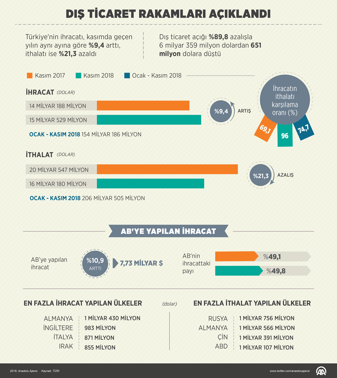 Türkiye İstatistik Kurumu (TÜİK) ile Ticaret Bakanlığı tarafından oluşturulan kasım ayına ve ocak-kasım dönemine ilişkin geçici dış ticaret istatistikleri açıklandı. Buna göre, ihracat kasımda geçen yılın aynı ayına göre yüzde 9,4 artışla 15 milyar 529 milyon dolara yükselirken, ithalat yüzde 21,3 azalarak 16 milyar 180 milyon dolara geriledi. ( Muhammed Ali Yiğit - Anadolu Ajansı )31 Aralık 2018•Güncelleme: 31 Aralık 2018