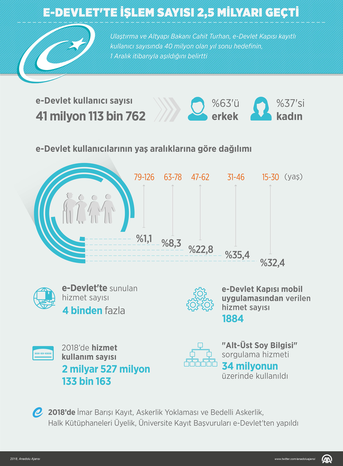 Ulaştırma ve Altyapı Bakanı Turhan, "e-Devlet Kapısı kayıtlı kullanıcı sayısında 40 milyonu 1 Aralık'ta aştık. Bu yıl toplam hizmet kullanım sayısı, 2 milyar 527 milyon 133 bin 163'e ulaştı." dedi. ( Gözde Gültekinler - Anadolu Ajansı )