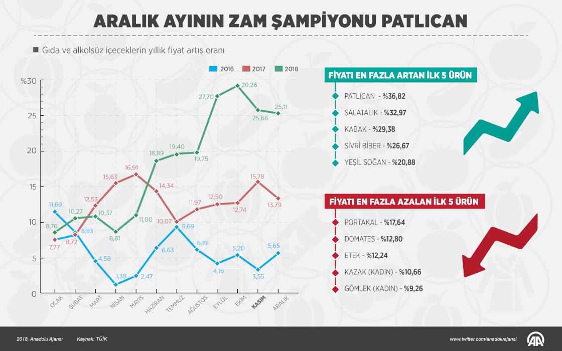 Türkiye İstatistik Kurumu (TÜİK) verilerine göre, fiyat artışında patlıcanı, yüzde 32,97 ile salatalık, yüzde 29,38 ile kabak izledi. Aralıkta fiyatı en çok artan diğer ürünler arasında yüzde 26,67 ile sivri biber, yüzde 20,88 ile yeşil soğan, yüzde 16,40 ile kuru soğan, yüzde 13,21 ile hijyenik ped, yüzde 9,36 ile patates, yüzde 7,60 ile hazır çorba, yüzde 6,57 ile kraker yer aldı. ( Muhammed Ali Yiğit - Anadolu Ajansı )03 Ocak 2019•Güncelleme: 03 Ocak 2019