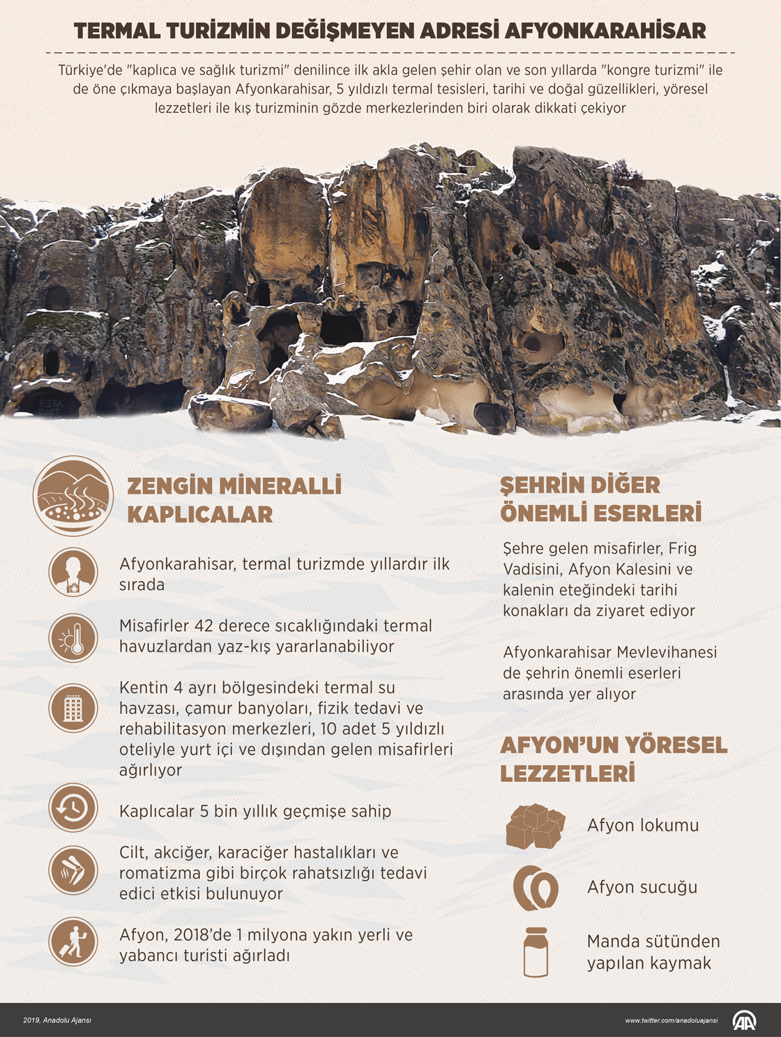 Türkiye'de "kaplıca ve sağlık turizmi" denilince ilk akla gelen şehir olan ve son yıllarda "kongre turizmi" ile de öne çıkmaya başlayan Afyonkarahisar, 5 yıldızlı termal tesisleri, tarihi ve doğal güzellikleri, yöresel lezzetleriyle kış turizminin gözde merkezleri arasında yer alıyor. ( Muhammed Ali Yiğit - Anadolu Ajansı )06 Ocak 2019•Güncelleme: 06 Ocak 2019
