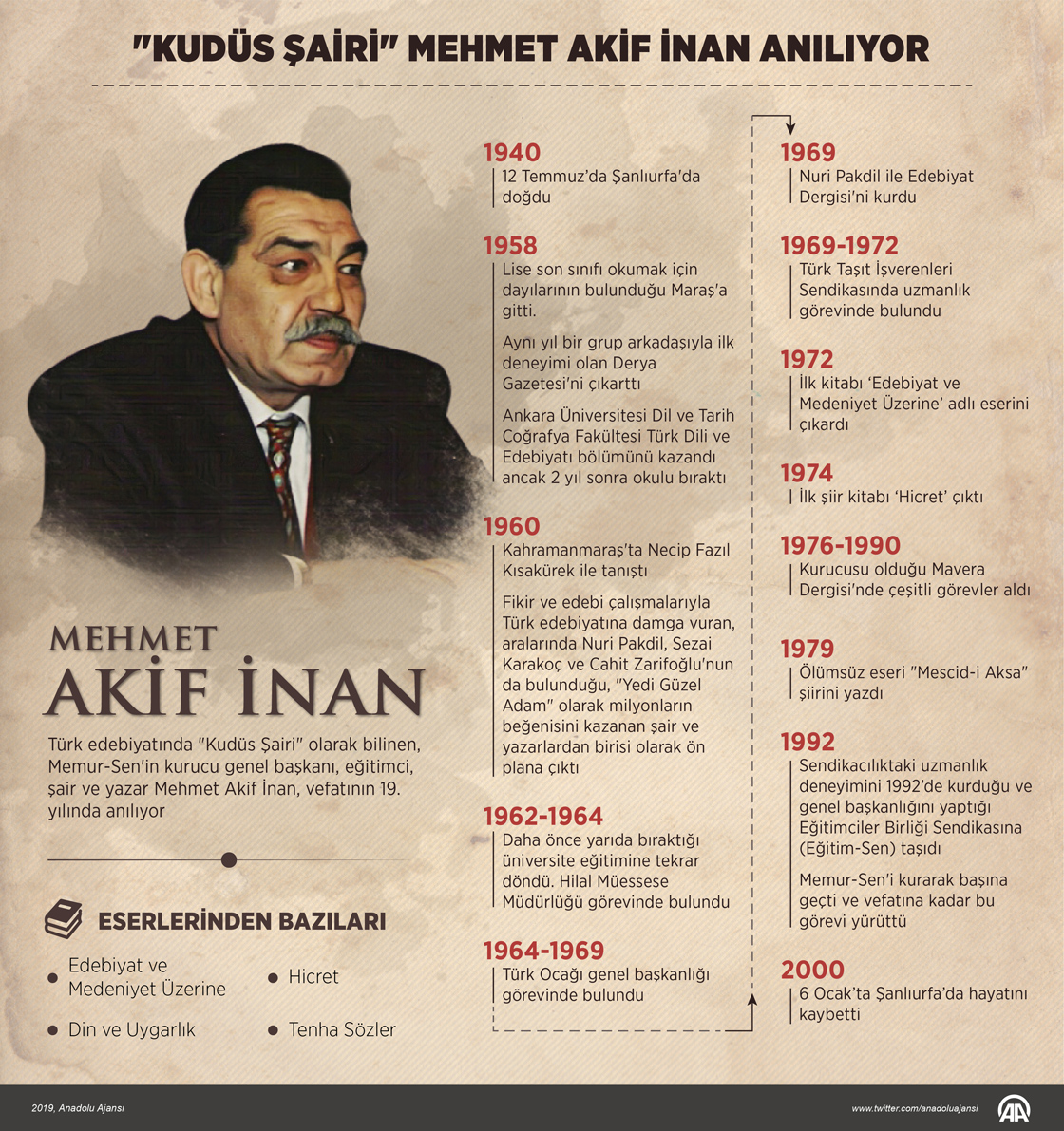 Türk edebiyatında "Kudüs Şairi" olarak bilinen, Memur-Sen'in kurucu genel başkanı, eğitimci, şair ve yazar Mehmet Akif İnan, vefatının 19. yılında anılıyor. ( Muhammed Ali Yiğit - Anadolu Ajansı )