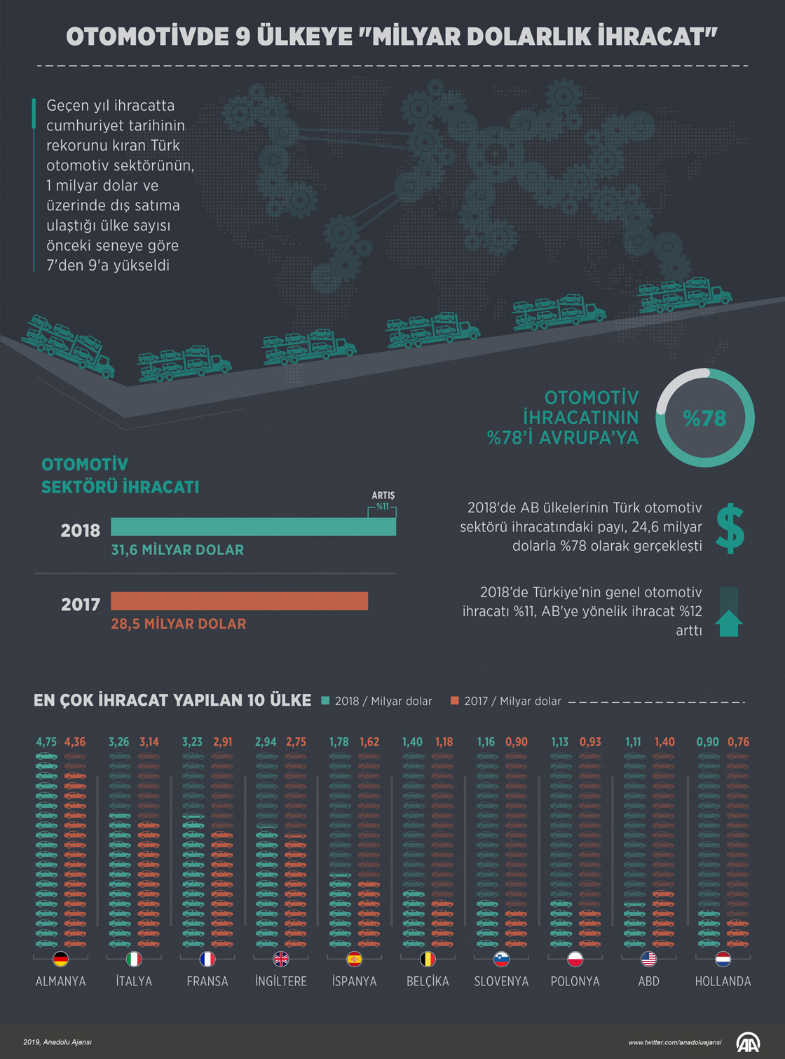 Geçen yıl ihracatta cumhuriyet tarihinin rekorunu kıran Türk otomotiv sektörünün, 1 milyar dolar ve üzerinde dış satıma ulaştığı ülke sayısı önceki seneye göre 7'den 9'a yükseldi.