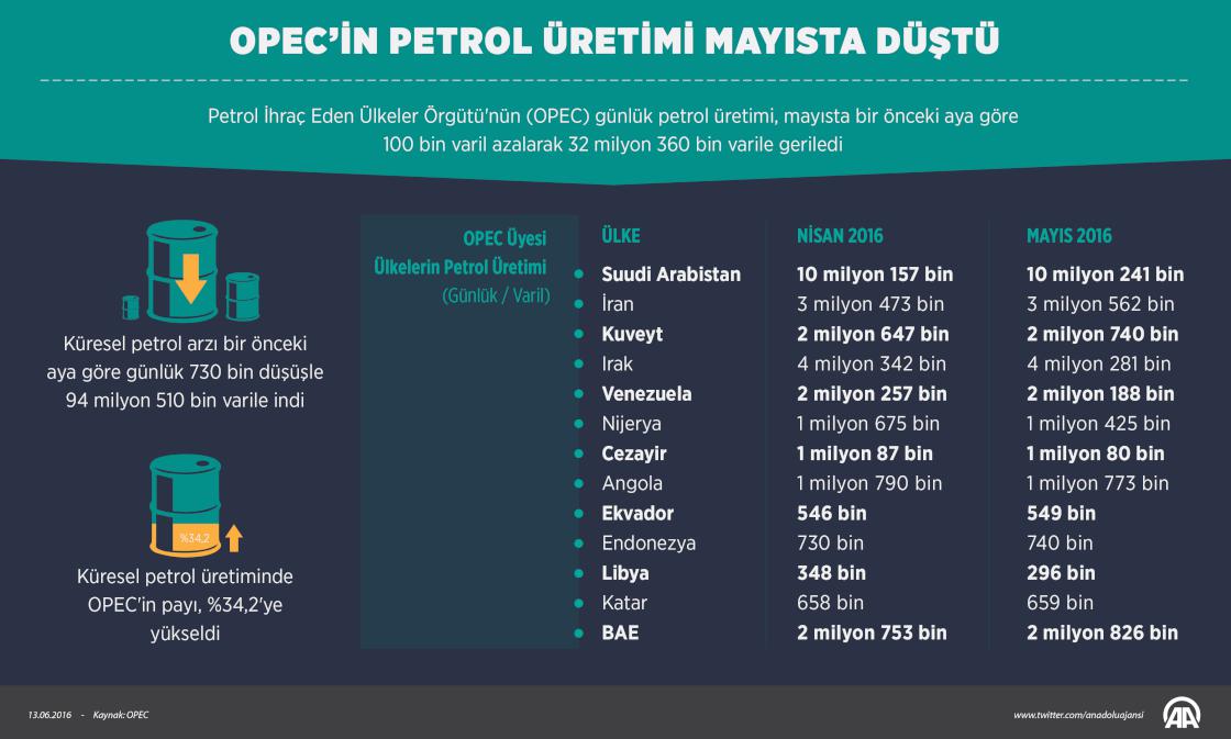 Petrol İhraç Eden Ülkeler Örgütü'nün (OPEC) günlük petrol üretimi, mayısta bir önceki aya göre 100 bin varil azalarak 32 milyon 360 bin varile geriledi. ( Grafik: Yasin Demirci - Anadolu Ajansı )