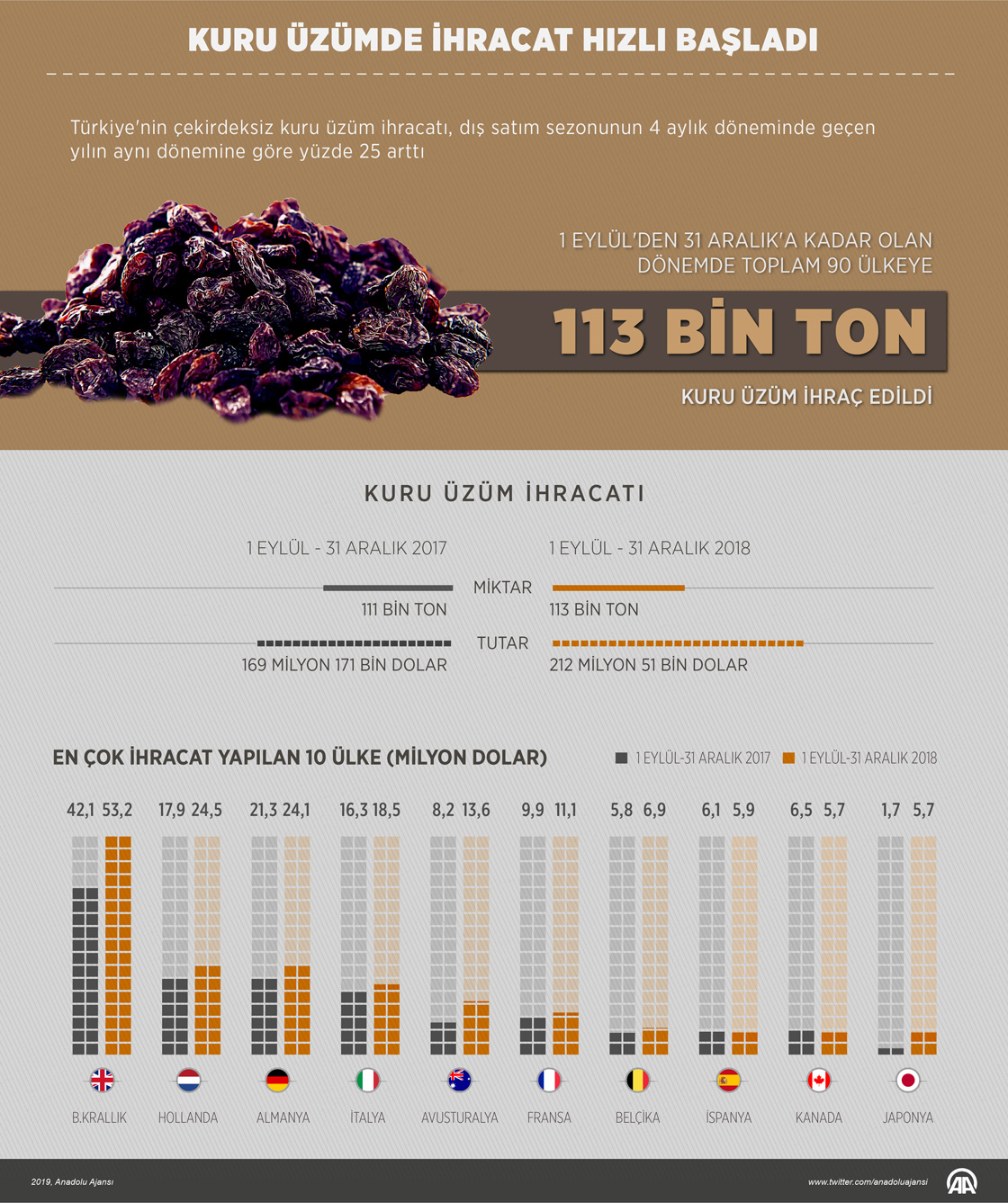 Türkiye'nin çekirdeksiz kuru üzüm ihracatı, dış satım sezonunun 4 aylık döneminde geçen yılın aynı dönemine göre yüzde 25 artarak 212 milyon 51 bin dolara yükseldi. ( Kemal Delikmen - Anadolu Ajansı )