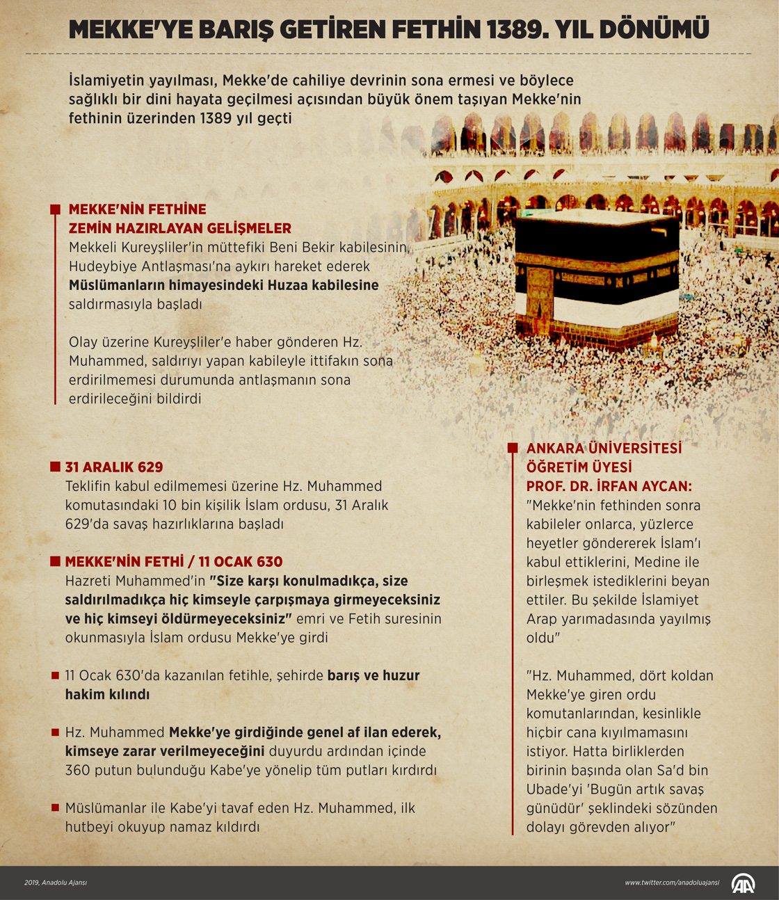 İslamiyetin yayılması, Mekke'de cahiliye devrinin sona ermesi ve böylece sağlıklı bir dini hayata geçilmesi açısından büyük önem taşıyan Mekke'nin fethinin üzerinden 1389 yıl geçti. Fetih Suresi'nin okunarak Mekke'ye girilmesiyle 11 Ocak 630'da kazanılan fetihle, şehirde barış ve huzur hakim kılındı.