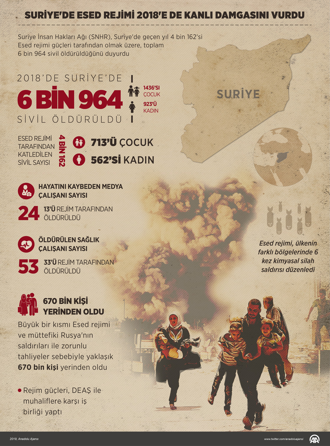 Suriye İnsan Hakları Ağı (SNHR), ülkede geçen yıl 4 bin 162'si Esed rejimi güçleri tarafından olmak üzere, toplam 6 bin 964 sivilin öldürüldüğünü duyurdu.