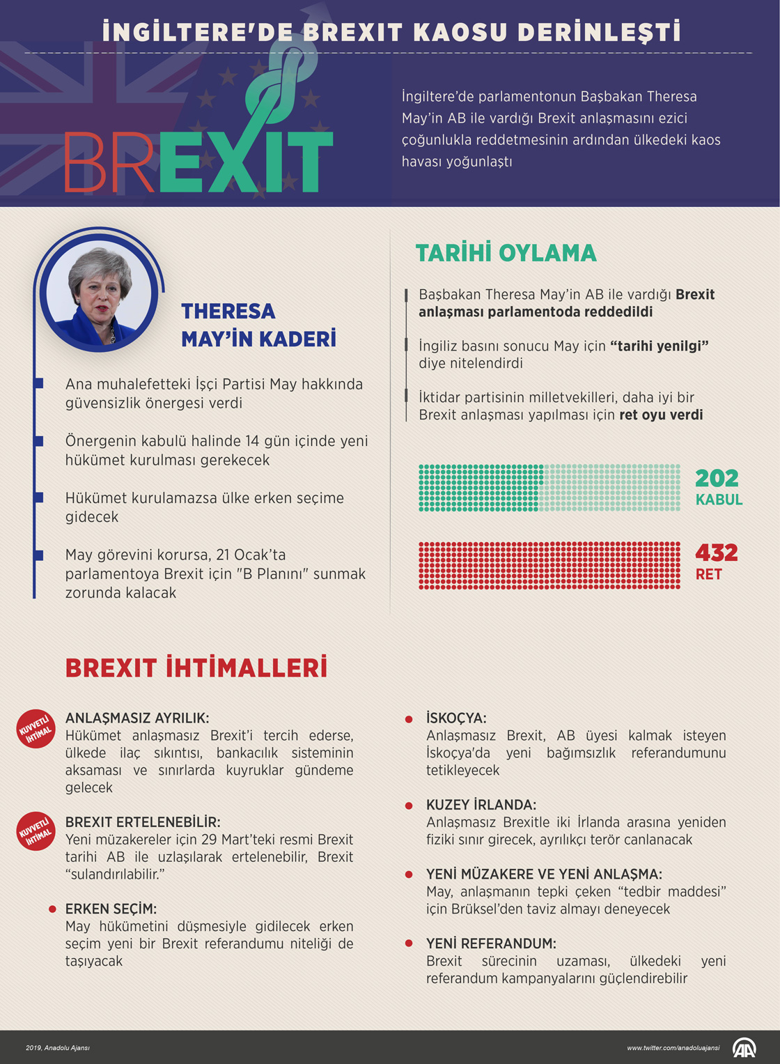 İngiltere'de parlamentonun, Başbakan Theresa May'in Avrupa Birliği (AB) ile vardığı Brexit anlaşmasını ezici çoğunlukla reddetmesinin ardından ülkedeki kaos havası yoğunlaştı. İngiliz parlamentosunda dün akşam yapılan oylamada May'in AB ile vardığı Brexit anlaşması, 202'ye karşı 432 oyla reddedildi. ( Kemal Delikmen - Anadolu Ajansı )16 Ocak 2019•Güncelleme: 16 Ocak 2019