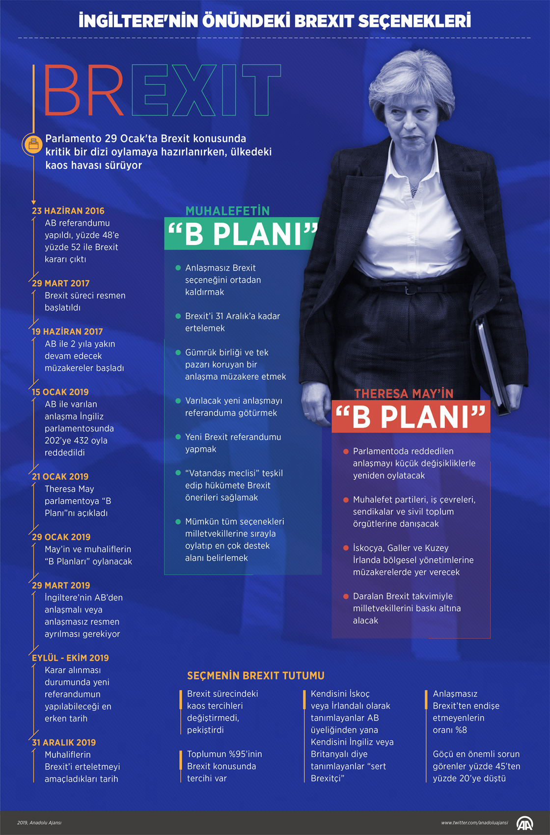 Parlamento 29 Ocak'ta Brexit konusunda kritik bir dizi oylamaya hazırlanırken, ülkedeki kaos havası sürüyor. Başbakan Theresa May "B planı" adı altında, reddedilen ilk anlaşmayı ufak değişikliklerle yeniden parlamentoya sunacak. ( Yasin Demirci - Anadolu Ajansı )23 Ocak 2019•Güncelleme: 23 Ocak 2019