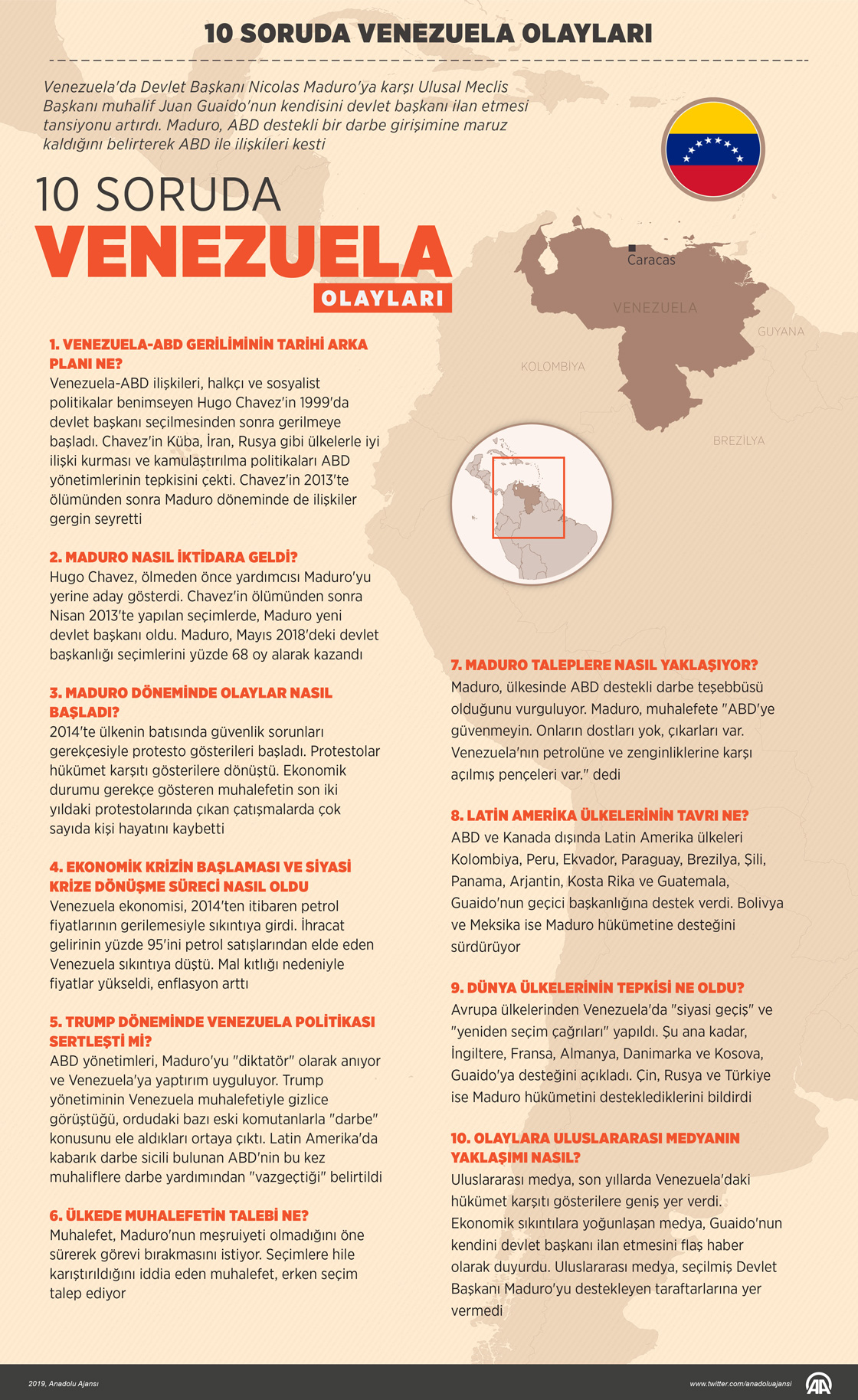 Venezuela'da Devlet Başkanı Nicolas Maduro'ya karşı Ulusal Meclis Başkanı muhalif Juan Guaido'nun kendisini devlet başkanı ilan etmesi ülkede tansiyonu artırırken Maduro da ABD destekli bir darbe girişimine maruz kaldığını belirterek ABD ile ilişkileri kesti ve Amerikalı diplomatlara ülkeyi terk etmeleri için 72 saat süre verdi. ( Kemal Delikmen - Anadolu Ajansı )24 Ocak 2019•Güncelleme: 24 Ocak 2019