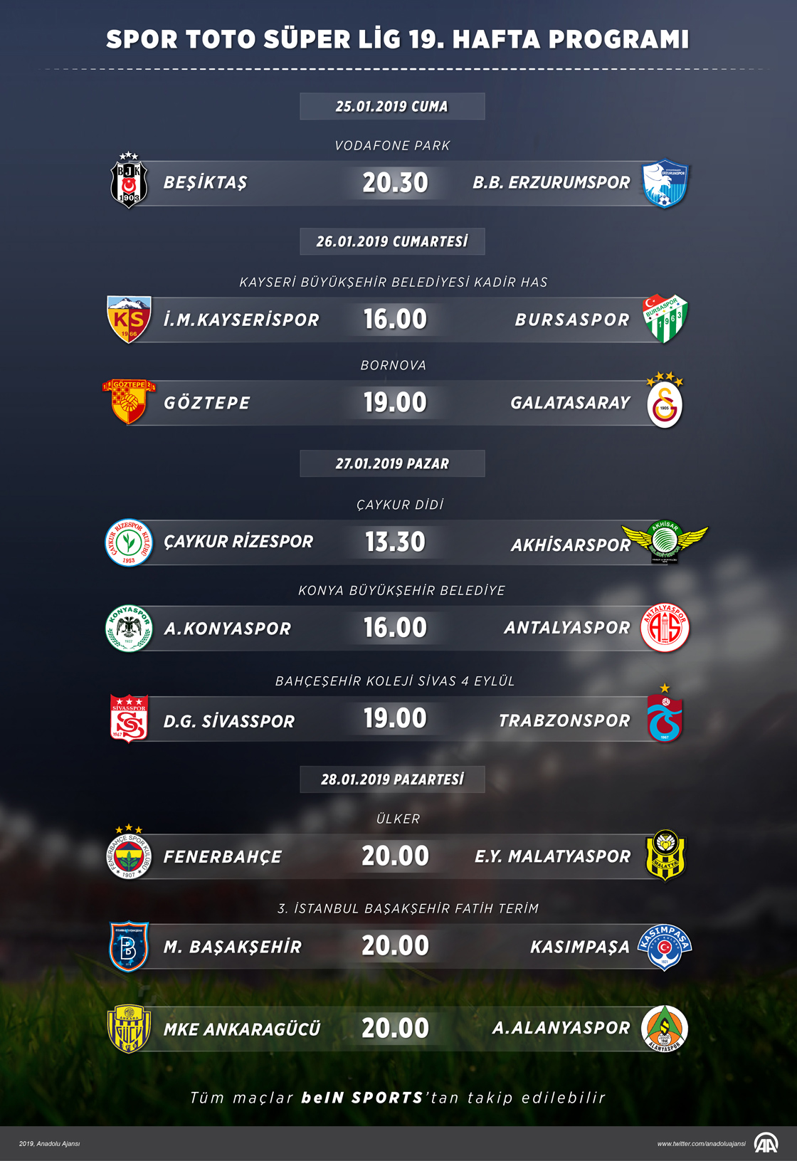 Spor Toto Süper Lig'de 19. haftada ilk maç 25 Ocak Cuma günü Beşiktaş ile Büyükşehir Belediye Erzurumspor arasında oynanacak. 26 Ocak Cumartesi günü 2, 27 Ocak Pazar ve 28 Ocak Pazartesi günü 3'er maç oynanacak. (Anadolu Ajansı - Kemal Delikmen)