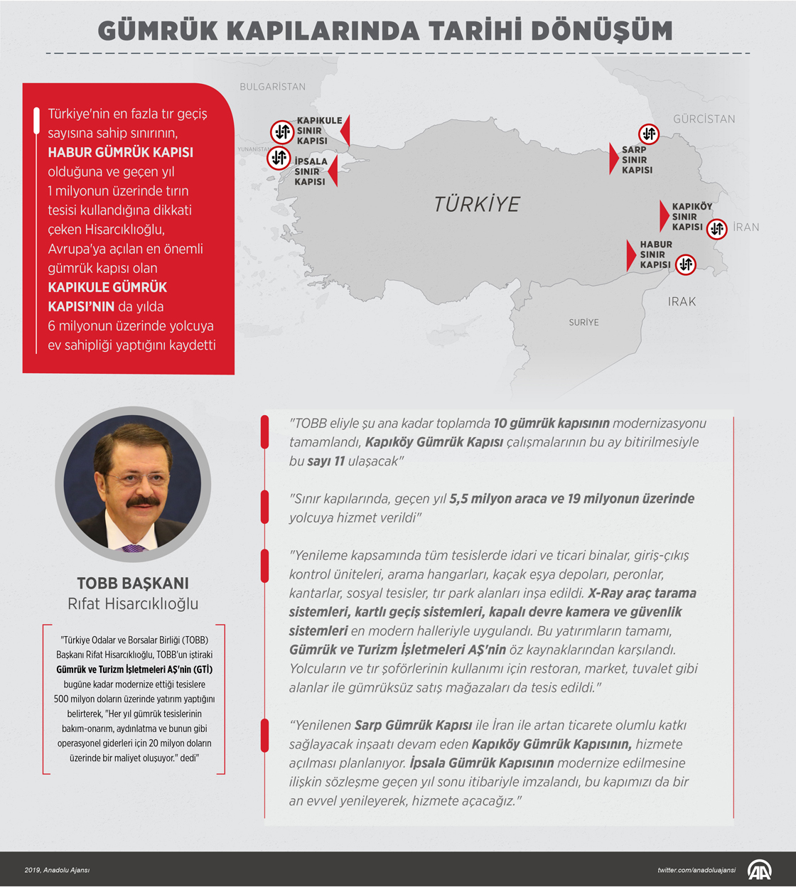 Türkiye Odalar ve Borsalar Birliği (TOBB) Başkanı Rifat Hisarcıklıoğlu, TOBB'un iştiraki Gümrük ve Turizm İşletmeleri AŞ'nin (GTİ) bugüne kadar modernize ettiği tesislere 500 milyon doların üzerinde yatırım yaptığını belirterek, "Her yıl gümrük tesislerinin bakım-onarım, aydınlatma ve bunun gibi operasyonel giderleri için 20 milyon doların üzerinde bir maliyet oluşuyor." dedi.26 Ocak 2019•Güncelleme: 26 Ocak 2019