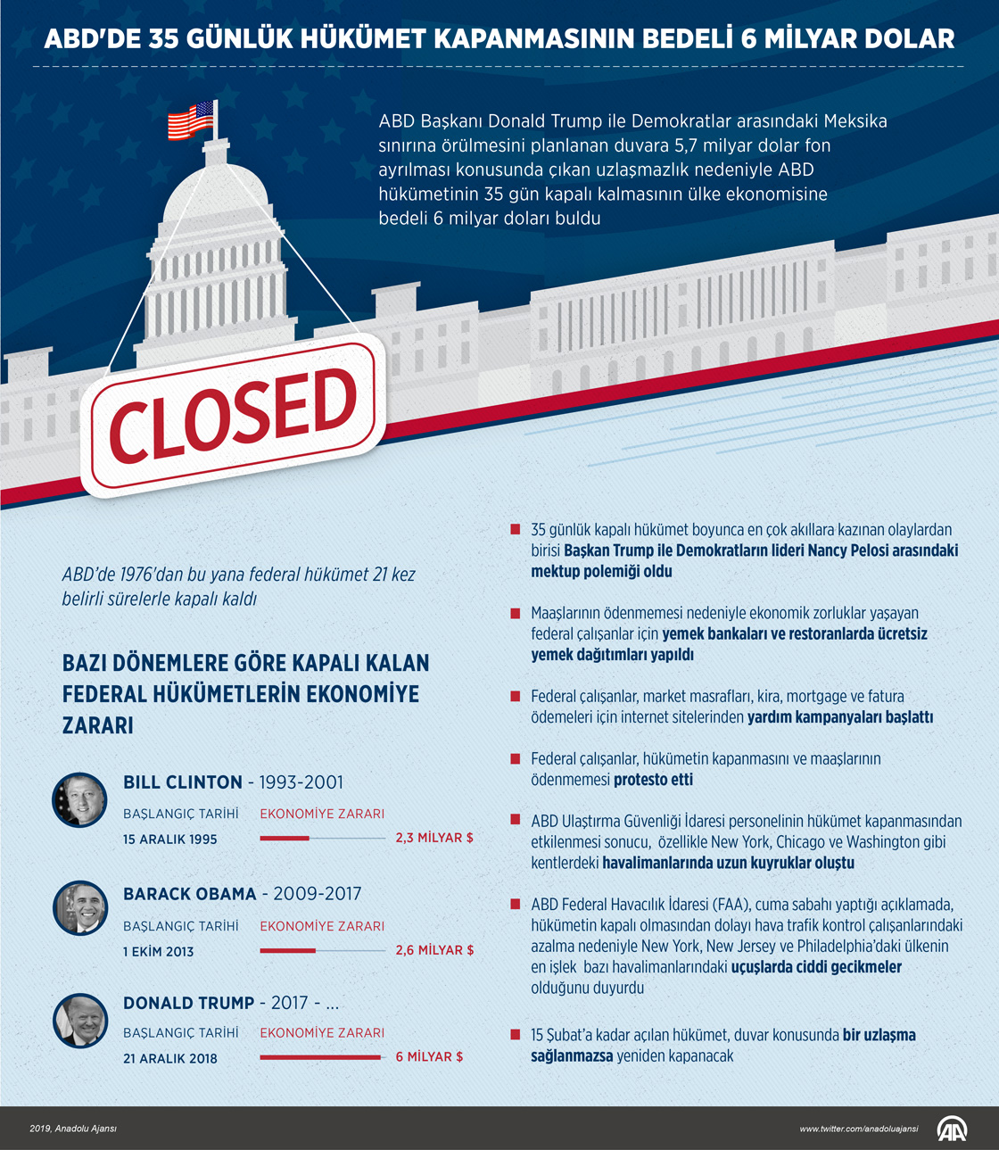 Başkanı Donald Trump ile Demokratlar arasındaki Meksika sınırına örülmesini planlanan duvara 5,7 milyar dolar fon ayrılması konusunda çıkan uzlaşmazlık nedeniyle ABD hükümetinin 35 gün kapalı kalmasının ülke ekonomisine bedeli 6 milyar doları buldu.