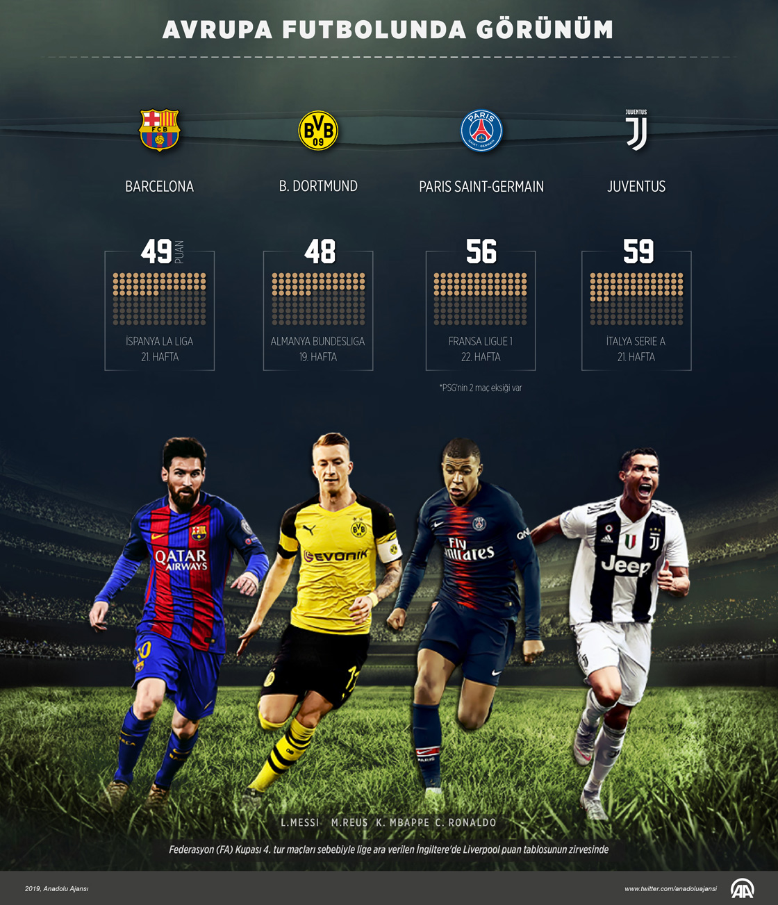 Avrupa'nın 5 büyük ligi arasındaki İngiltere'de (Premier Lig) kupa maçları nedeniyle maç oynanmazken İspanya (La Liga), İtalya (Serie A), Almanya (Bundesliga) ve Fransa'daki (Ligue 1) karşılaşmalara, hafta sonu devam edildi. ( Kemal Delikmen - Anadolu Ajansı )