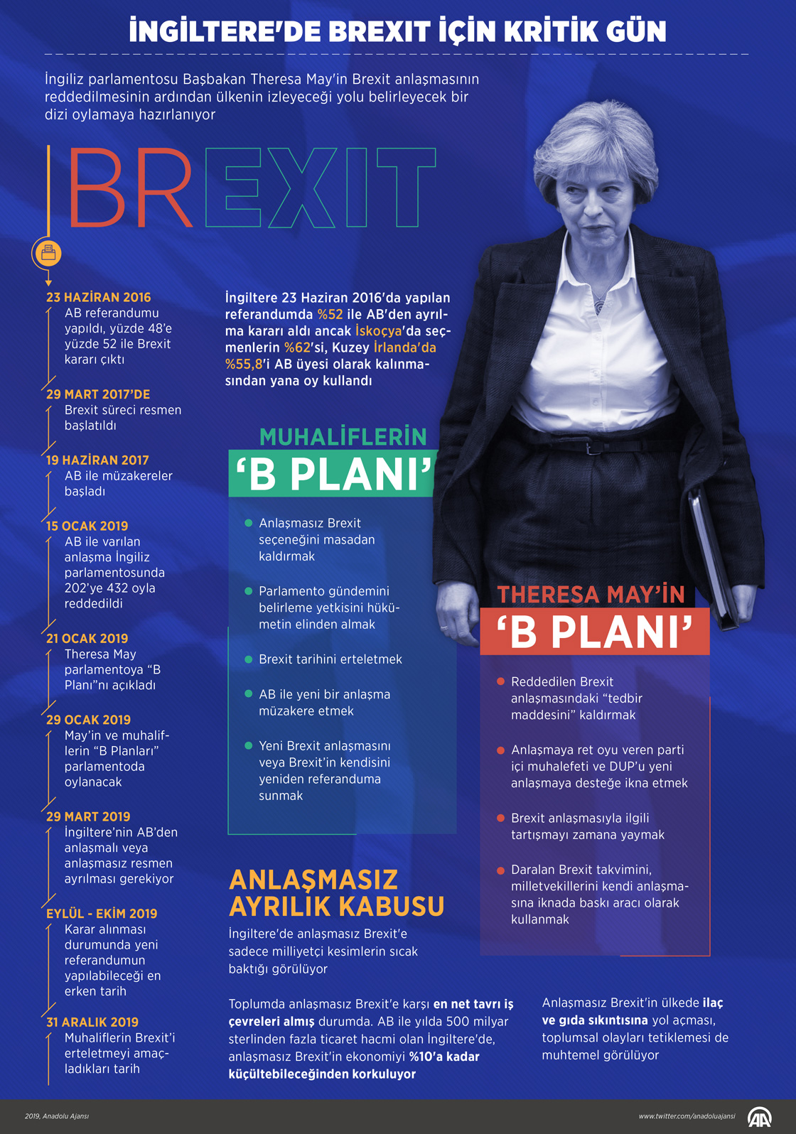 İngiliz parlamentosu Başbakan Theresa May'in Brexit anlaşmasının reddedilmesinin akabinde ülkenin izleyeceği yolu belirleyecek bir dizi oylama yapacak. Başbakan Theresa May’in kasım ayında AB ile vardığı Brexit anlaşmasının parlamentonun alt kanadı Avam Kamarasında 15 Ocak'ta yapılan oylamada 202'ye karşı 432 oy gibi tarihi bir farkla reddedilmesinin ardından milletvekilleri ülkenin izleyeceği yol haritasını bugün belirleyecek. ( Murat Usubaliev - Anadolu Ajansı )29 Ocak 2019•Güncelleme: 29 Ocak 2019