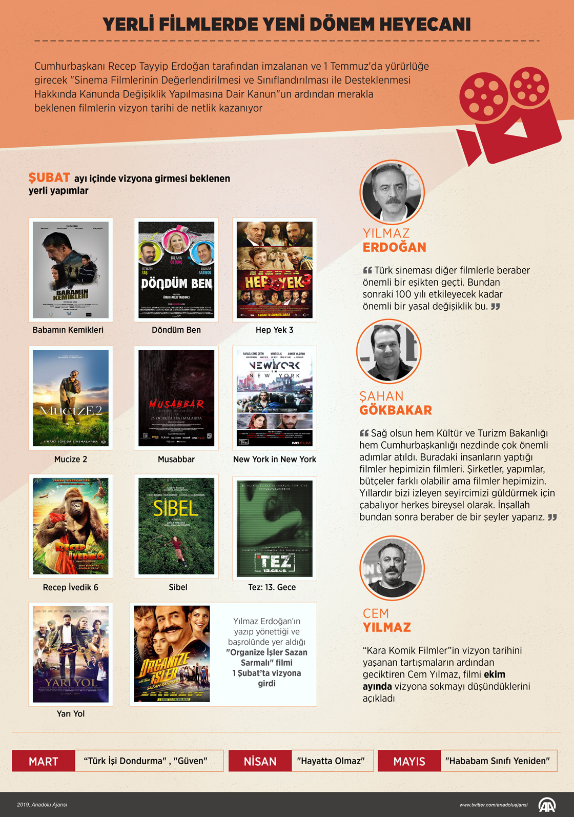 Cumhurbaşkanı Recep Tayyip Erdoğan tarafından imzalanan ve 1 Temmuz'da yürürlüğe girecek olan Sinema Filmlerinin Değerlendirilmesi ve Sınıflandırılması ile Desteklenmesi Hakkında Kanunda Değişiklik Yapılmasına Dair Kanun'un ardından merakla beklenen filmlerin vizyon tarihi netlik kazanmaya başladı. (Anadolu Ajansı - Mevlüt Eren)01 Şubat 2019•Güncelleme: 01 Şubat 2019