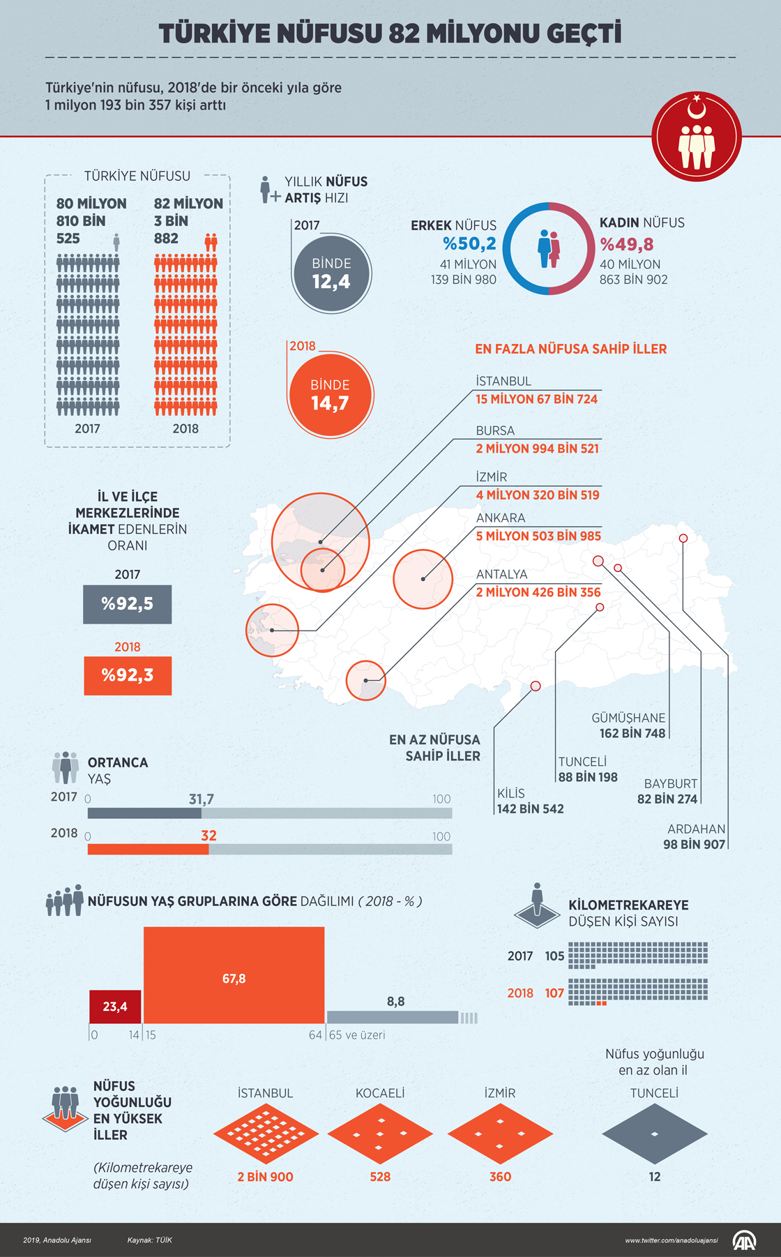 ürkiye'nin nüfusu, 2018'de bir önceki yıla göre 1 milyon 193 bin 357 kişi artarak 82 milyon 3 bin 882 kişi oldu.