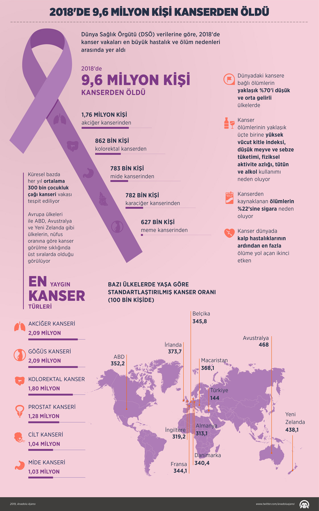 Dünya Sağlık Örgütü (DSÖ) verilerine göre, 2018'de kanser vakaları en büyük hastalık ve ölüm nedenleri arasında yer aldı. Geçen yıl dünyada yaklaşık 18,1 milyon yeni kanser vakası ortaya çıkarken, 9,6 milyon kişi de kanserden yaşamını yitirdi. ( Yasin Demirci - Anadolu Ajansı )04 Şubat 2019•Güncelleme: 04 Şubat 2019