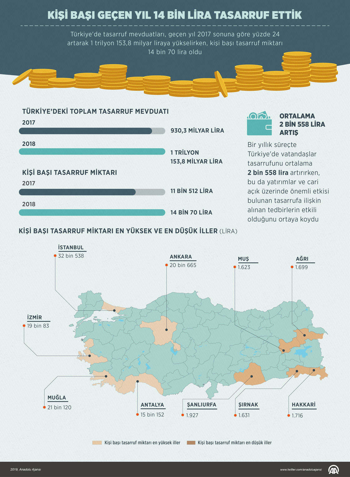 Türkiye'de 2017 sonunda 11 bin 512 lira olan kişi başı tasarruf miktarı, geçen yıl 14 bin 70 liraya ulaştı. ( Gözde Gültekinler - Anadolu Ajansı )