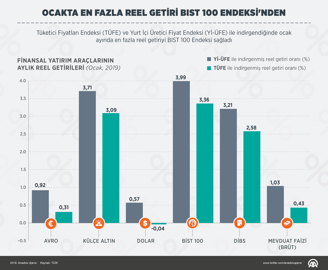 Tüketici Fiyatları Endeksi (TÜFE) ve Yurt İçi Üretici Fiyat Endeksi (Yİ-ÜFE) ile indirgendiğinde ocak ayında en fazla reel getiriyi BIST 100 Endeksi sağladı. ( Murat Usubaliev - Anadolu Ajansı )