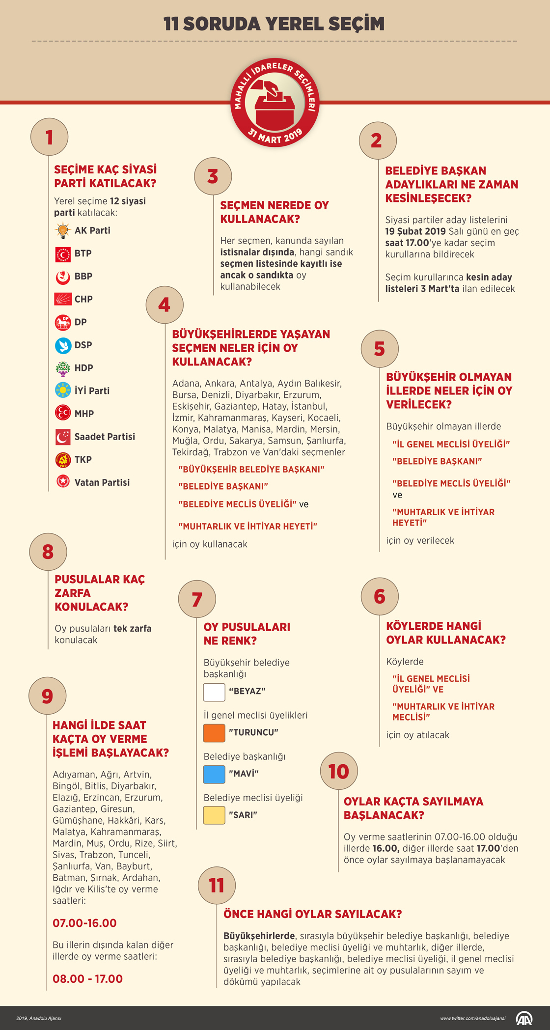 Yerel seçime 12 siyasi parti katılacak, kesin aday listeleri 3 Mart'ta ilan edilecek. Her seçmen, kanunda sayılan istisnalar dışında, hangi sandık seçmen listesinde kayıtlı ise ancak o sandıkta oy kullanabilecek. Büyükşehirde yaşayan seçmenler, "büyükşehir belediye başkanı", "belediye başkanı", "belediye meclis üyeliği" ile "muhtarlık ve ihtiyar heyeti" için oy kullanacak. Büyükşehir olmayan illerde ise "il genel meclisi üyeliği", "belediye başkanı", "belediye meclis üyeliği" ile "muhtarlık ve ihtiyar heyeti" için oy verilecek. ( Murat Usubaliev - Anadolu Ajansı )09 Şubat 2019•Güncelleme: 09 Şubat 2019