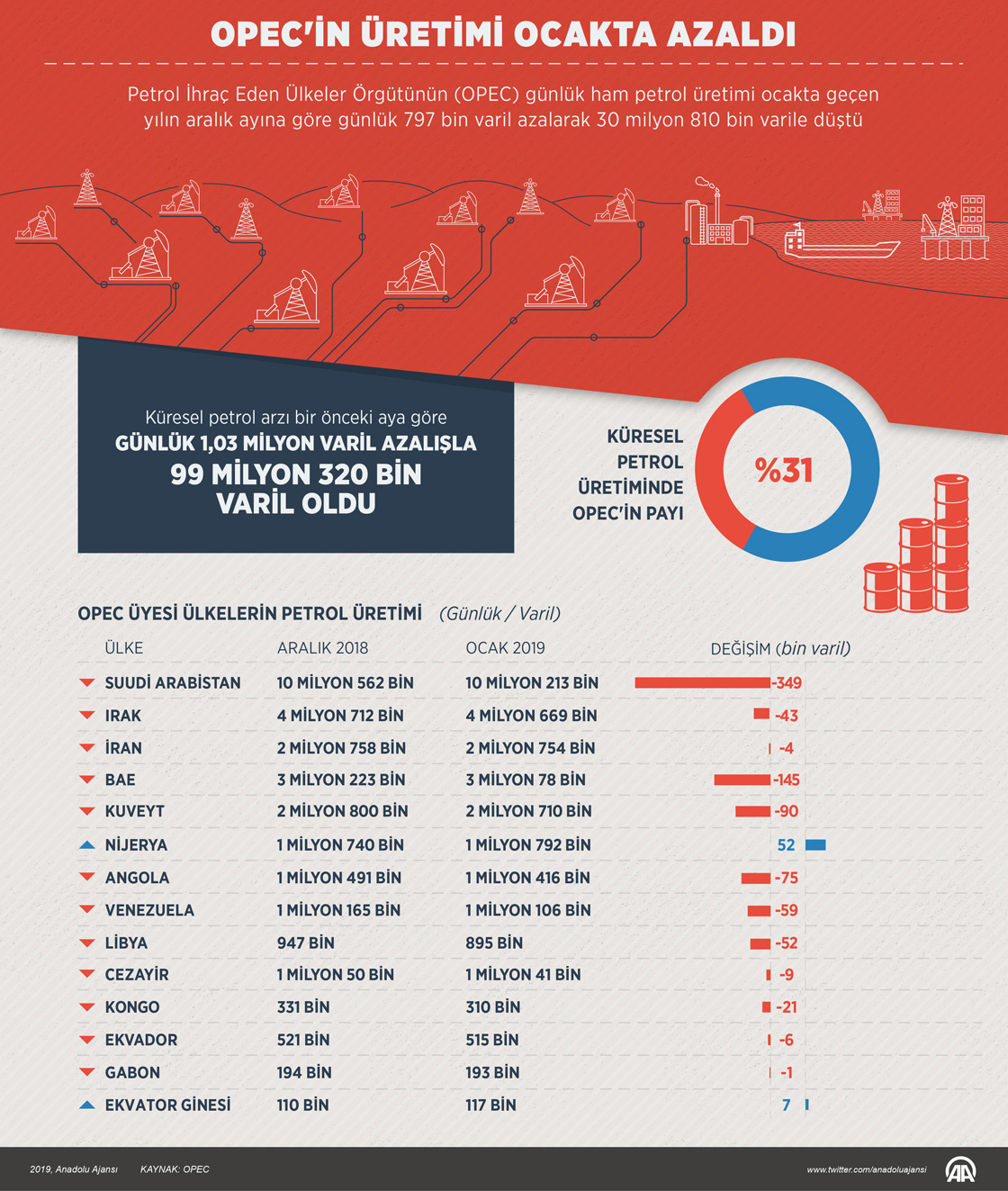 Petrol İhraç Eden Ülkeler Örgütünün (OPEC) günlük ham petrol üretimi ocakta geçen yılın aralık ayına göre günlük 797 bin varil azalarak 30 milyon 810 bin varile düştü.