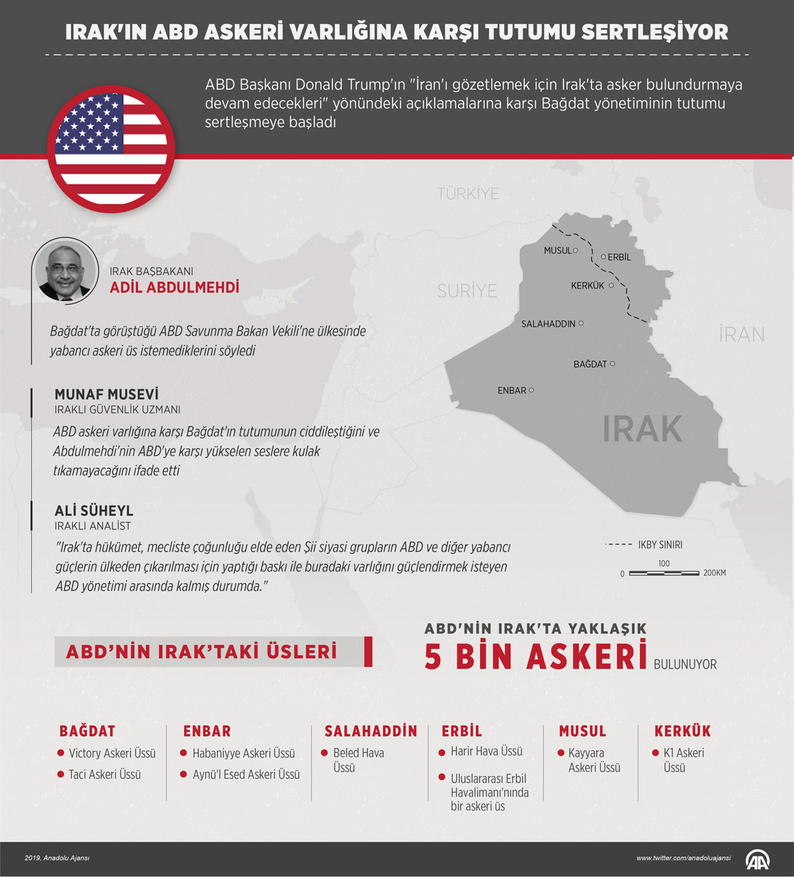 BD Başkanı Donald Trump'ın "İran'ı gözetlemek için Irak'ta asker bulundurmaya devam edecekleri" yönündeki açıklamalarına karşı Bağdat yönetiminin tutumu sertleşmeye başladı.