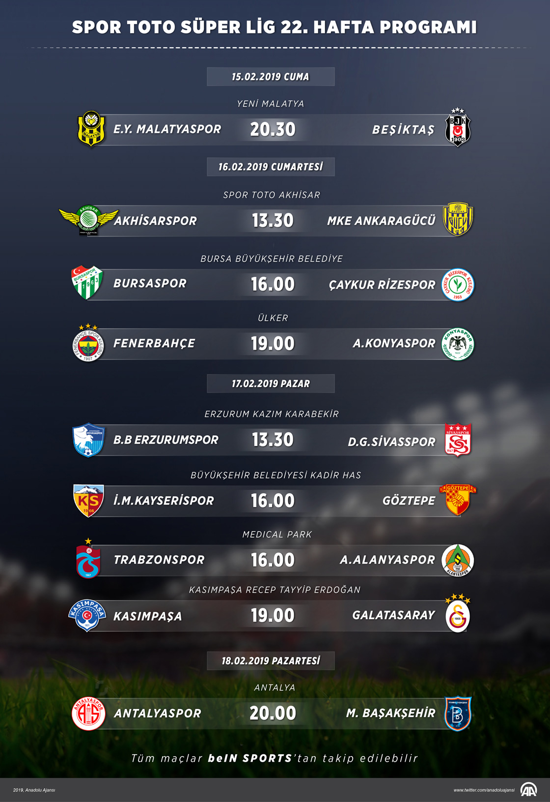 Spor Toto Süper Lig'de 22. haftasında ilk maç 15 Şubat Cuma günü Evkur Yeni Malatyaspor ile Beşiktaş arasında oynanacak. 16 Şubat Cumartesi günü 3, 17 Şubat Pazar günü 4 ve 18 Şubat Pazartesi günü ise tek maç oynanacak. ( Kemal Delikmen - Anadolu Ajansı )