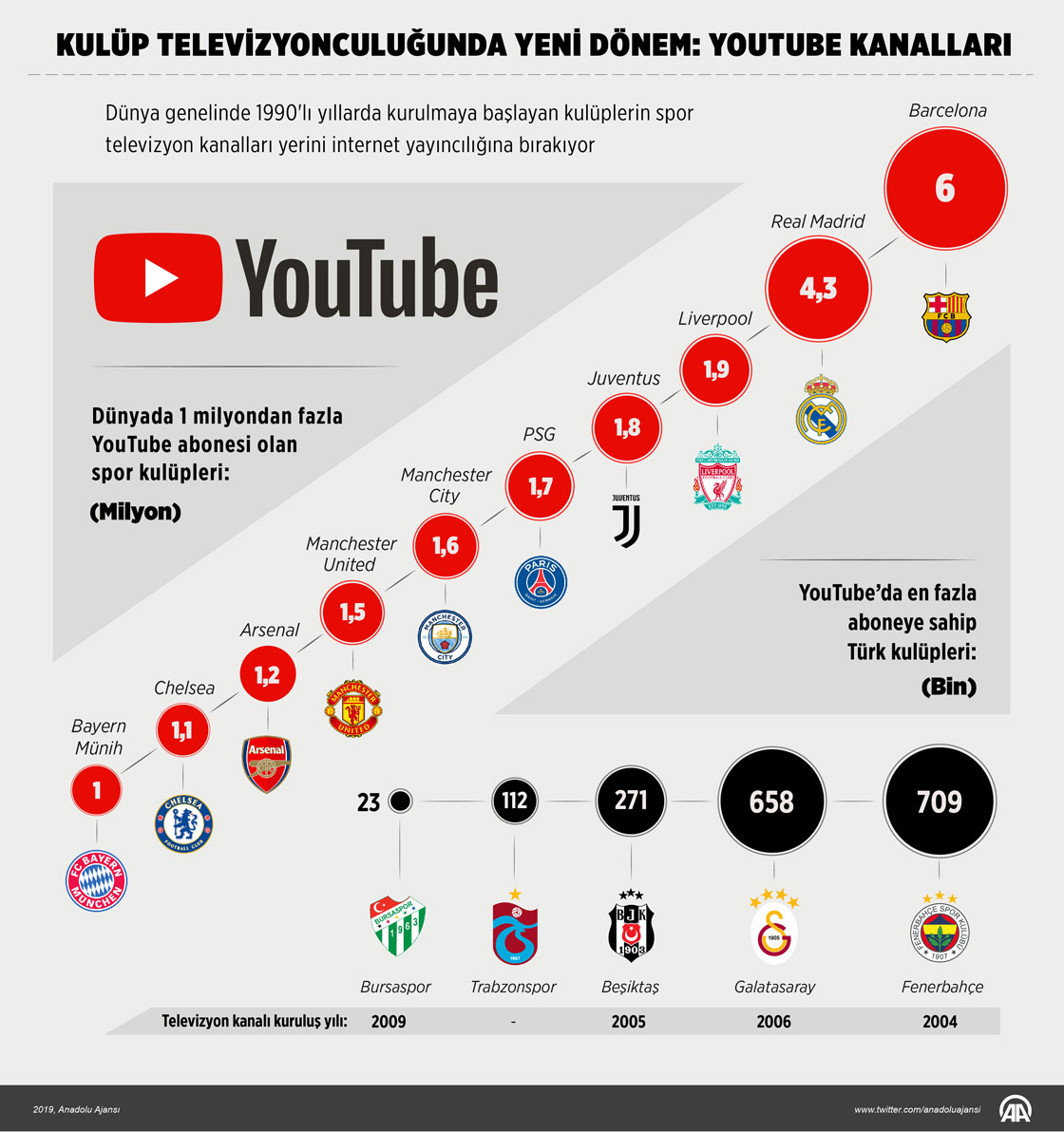 Dünya genelinde 1990'lı yıllarda kurulmaya başlayan kulüplerin spor televizyon kanallarının yerini 2000 yılından itibaren internet üzerinden yayın yapan YouTube kanalları almaya başladı. 6 milyon abonesi olan Barcelona, dünyada YouTube'dan en fazla izlenen spor kulübü olurken, Barcelona'yı 4,3 milyon abonesiyle ezeli rakibi Real Madrid takip ediyor. Fenerbahçe, Türkiye'de 709 bin abonesi ile YouTube üzerinden en fazla izlenen takım. Galatasaray, 658 bin abonesiyle ikinci sırada yer alırken, Beşiktaş'ın 271 bin, Trabzonspor'un 112 bin YouTube abonesi bulunuyor. 20 Şubat 2019•Güncelleme: 21 Şubat 2019