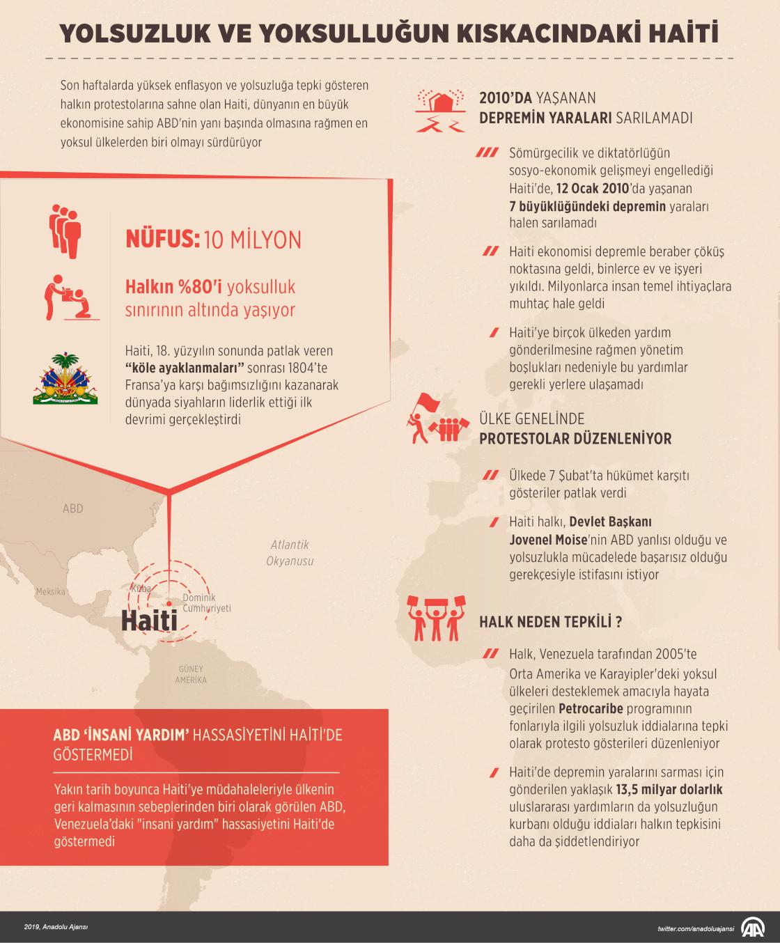 Son haftalarda yüksek enflasyon ve yolsuzluğa tepki gösteren halkın protestolarına sahne olan Haiti, dünyanın en büyük ekonomisine sahip ABD'nin yanı başında olmasına rağmen en yoksul ülkelerden biri olmayı sürdürüyor. ( Gözde Gültekinler - Anadolu Ajansı )22 Şubat 2019•Güncelleme: 22 Şubat 2019