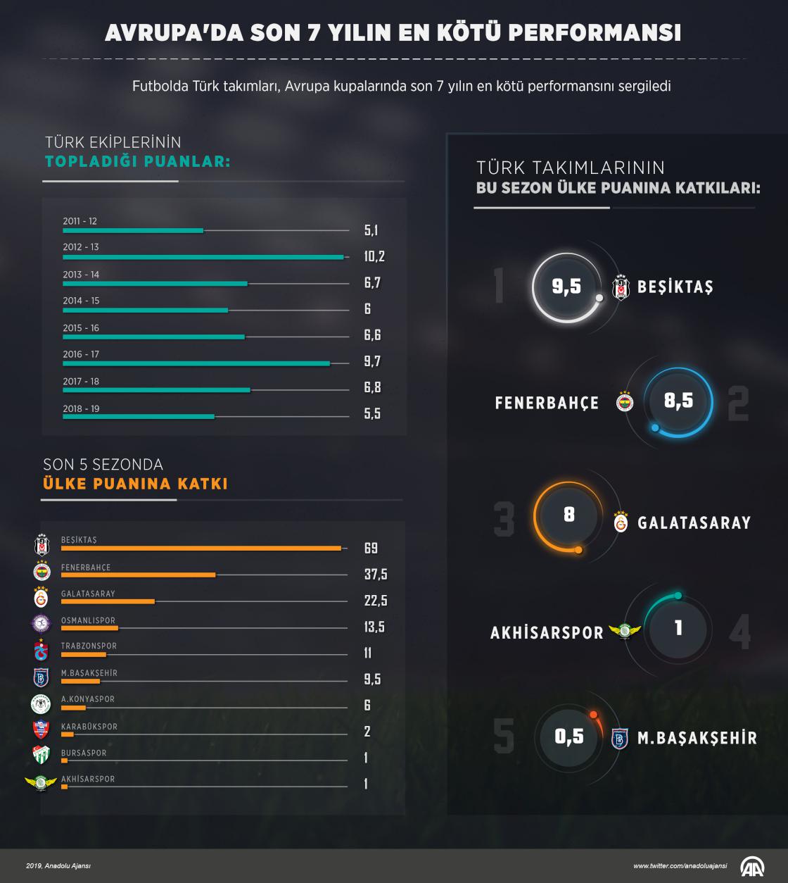 Türk takımlarının Avrupa macerası, bu sene de uzun soluklu olmadı. Kupalara 5 takımla katılan Türkiye’de Medipol Başakşehir ön elemede, Beşiktaş ve Akhisarspor grup maçlarında Avrupa’ya veda ederken, Fenerbahçe ve Galatasaray da 2 numaralı kupa UEFA Avrupa Ligi’ne son 32 turunda havlu attı.