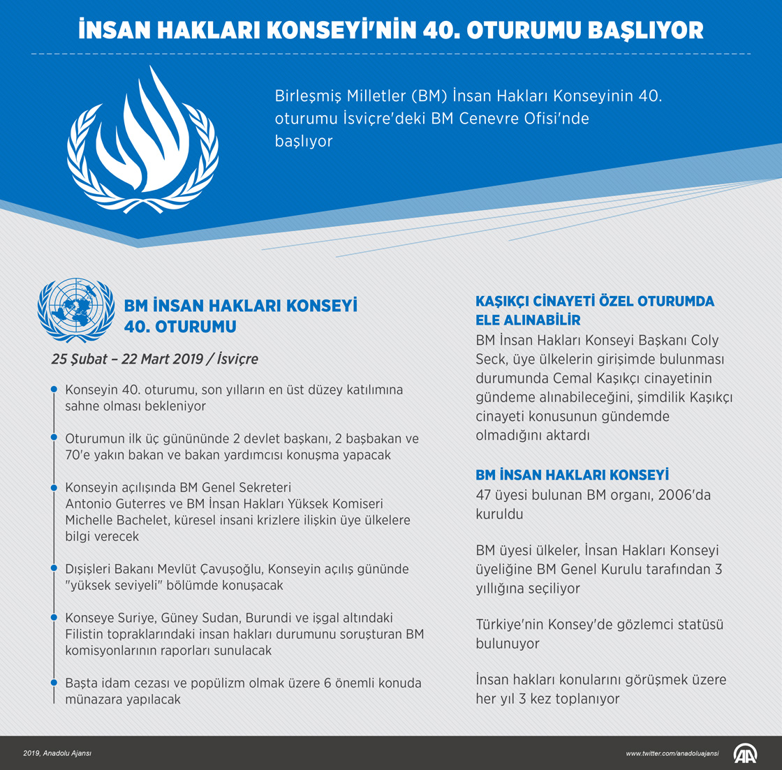 Birleşmiş Milletler (BM) İnsan Hakları Konseyinin 40. oturumu İsviçre'deki BM Cenevre Ofisi'nde yarın başlıyor.
