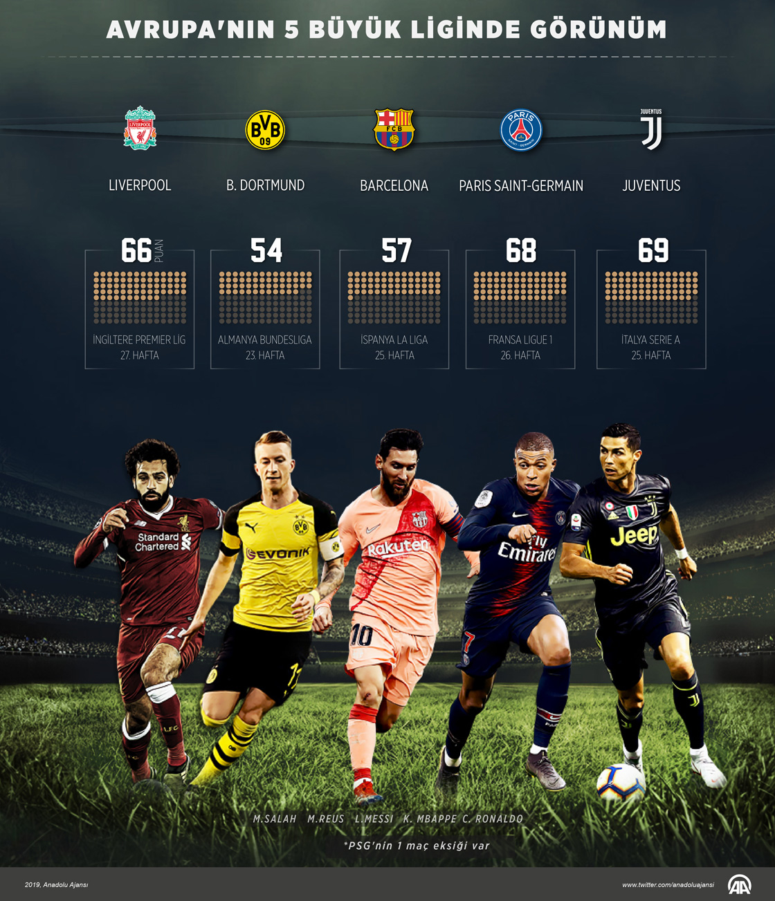 Avrupa'nın en büyük 5 futbol ligi kabul edilen İngiltere (Premier Lig), İspanya (La Liga), İtalya (Serie A), Almanya (Bundesliga) ve Fransa'daki (Ligue 1) karşılaşmalara, hafta sonu devam edildi. İngiltere'de Liverpool, İspanya'da Barcelona, İtalya'da Juventus, Almanya'da Borussia Dortmund, Fransa'da ise Paris Saint-Germain (PSG), puan tablosunun zirvesinde yer aldı.