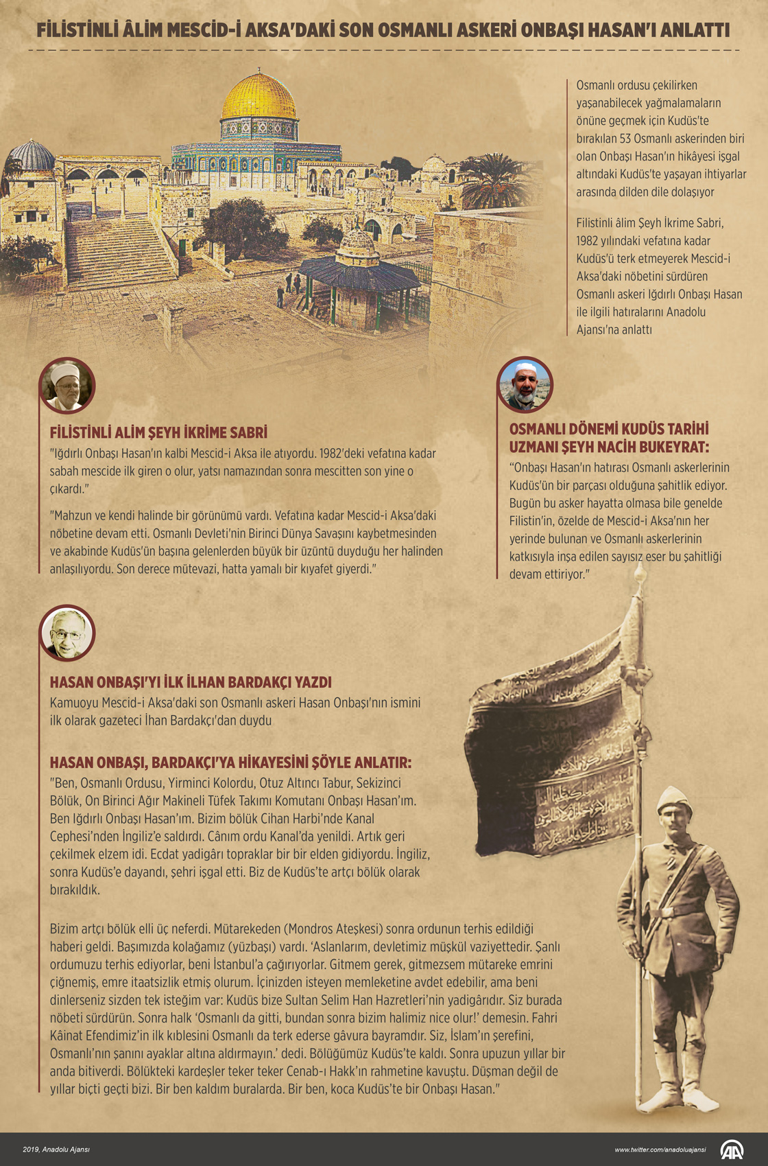 Filistinli âlim Şeyh İkrime Sabri, 1982 yılındaki vefatına kadar Kudüs'ü terk etmeyerek Mescid-i Aksa'daki nöbetini sürdüren Osmanlı askeri Iğdırlı Onbaşı Hasan ile ilgili hatıralarını Anadolu Ajansı'na anlattı.