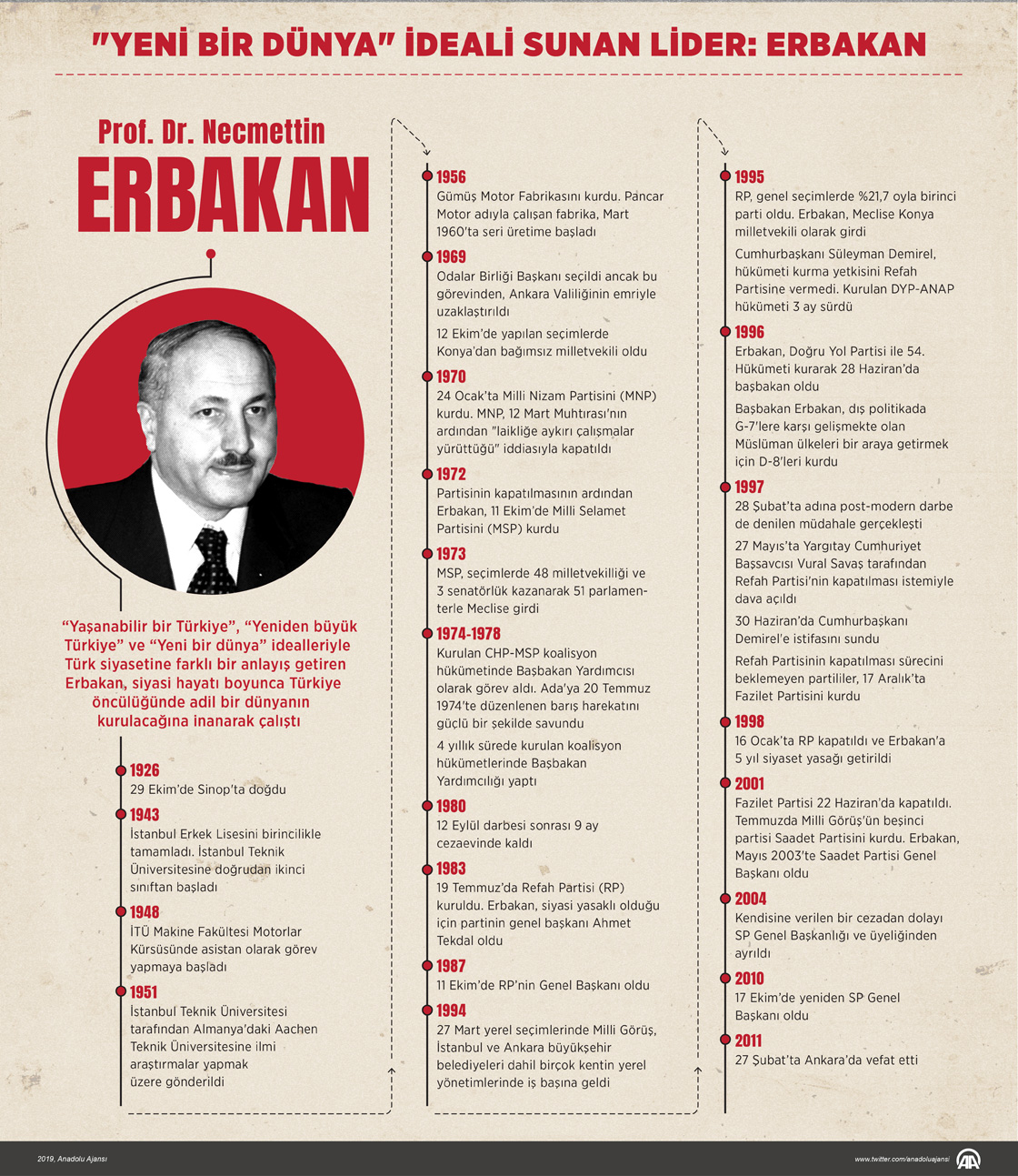 “Yaşanabilir bir Türkiye”, “Yeniden büyük Türkiye” ve “Yeni bir dünya” idealleriyle Türk siyasetine farklı bir anlayış getiren Erbakan, siyasi hayatı boyunca Türkiye öncülüğünde adil bir dünyanın kurulacağına inanarak çalıştı. ( Murat Usubaliev - Anadolu Ajansı )26 Şubat 2019•Güncelleme: 26 Şubat 2019