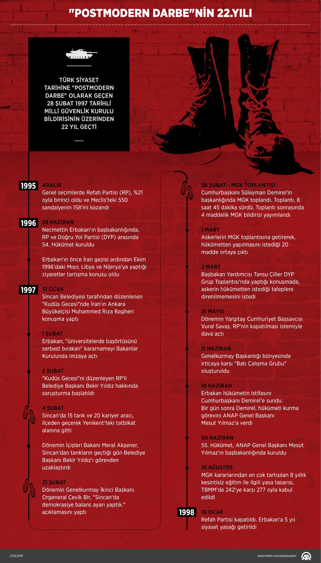 Refah Partisinin 1995'teki genel seçimlerden birinci çıkmasıyla başlayıp irtica tartışmalarıyla alevlenen sürecin kırılma noktalarından 28 Şubat 1997 tarihli Milli Güvenlik Kurulu (MGK) toplantısının üzerinden 22 yıl geçti. ( Yasin Demirci - Anadolu Ajansı )