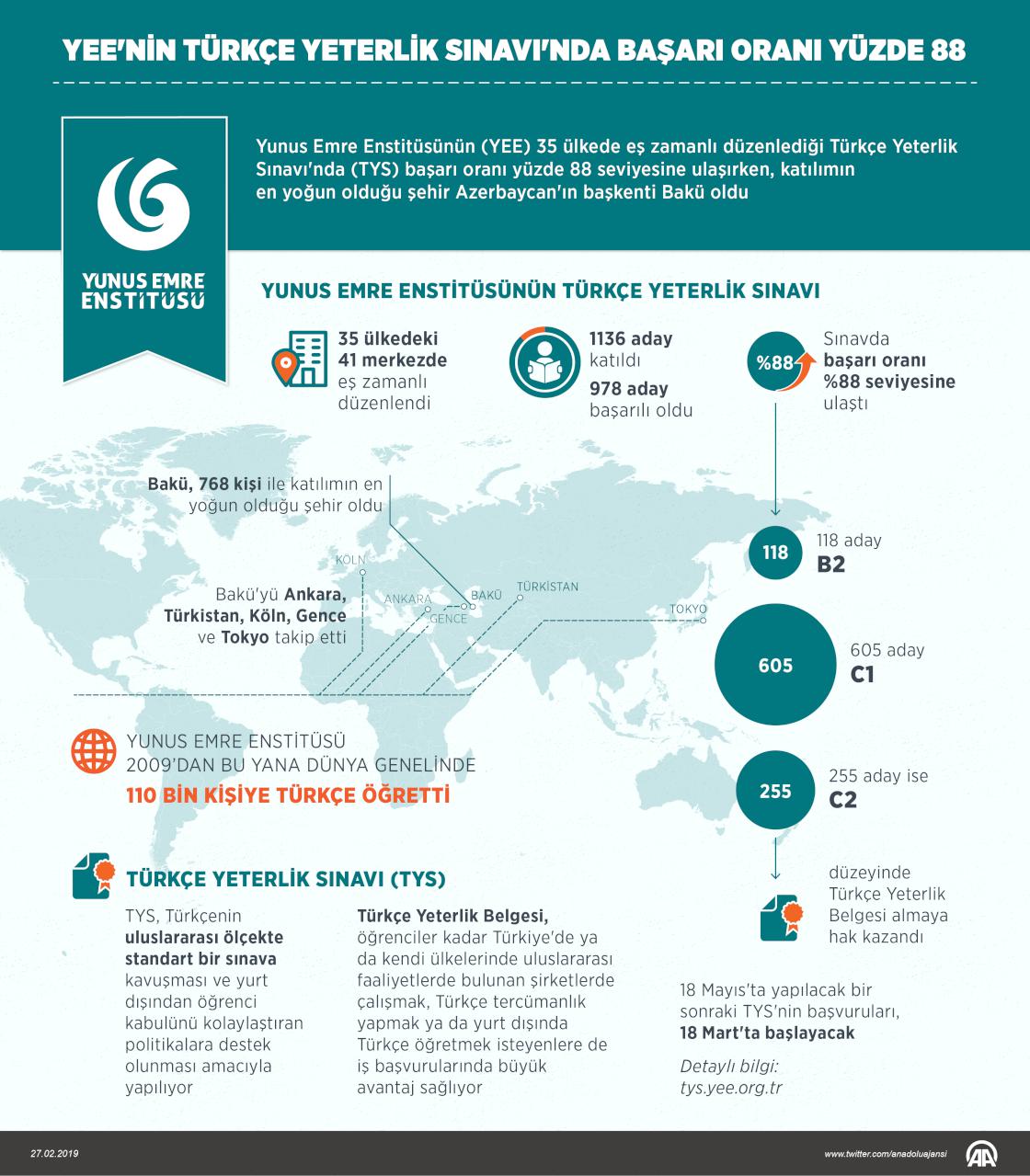 Yunus Emre Enstitüsü'nün (YEE) 35 ülkede eş zamanlı düzenlediği Türkçe Yeterlik Sınavı'nda (TYS) başarı oranı yüzde 88 seviyesine ulaşırken, katılımın en yoğun olduğu şehir Azerbaycan'ın başkenti Bakü oldu. ( Murat Usubaliev - Anadolu Ajansı )27 Şubat 2019•Güncelleme: 27 Şubat 2019