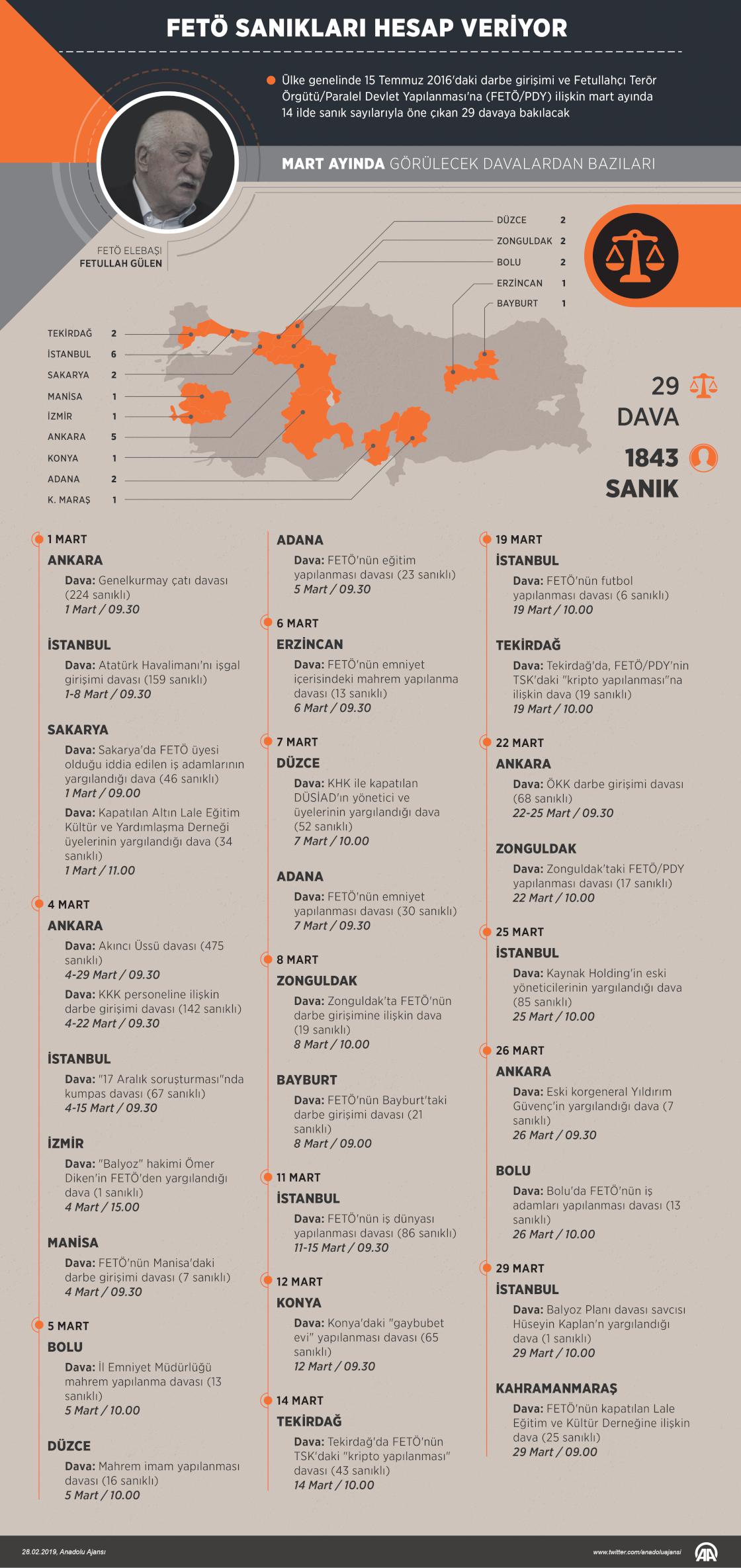 Hain darbe girişimi ve Fetullahçı Terör Örgütü/Paralel Devlet Yapılanması'na (FETÖ/PDY) ilişkin mart ayında 14 ilde sanık sayılarıyla öne çıkan 29 davaya bakılacak.