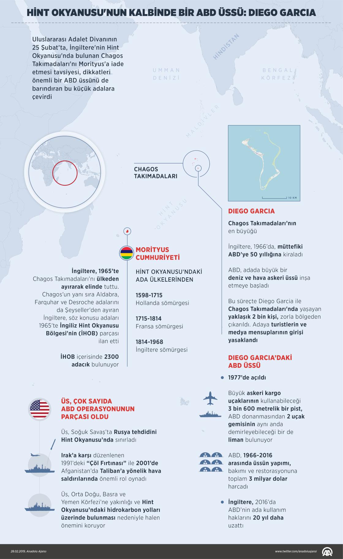 Uluslararası Adalet Divanının 25 Şubat Pazartesi günü, İngiltere'nin Hint Okyanusu'nda bulunan Chagos Takımadaları'nı Morityus'a iade etmesi tavsiyesi, dikkatleri önemli bir ABD üssünü de barındıran bu küçük adalara çevirdi. ( Yasin Demirci - Anadolu Ajansı )28 Şubat 2019•Güncelleme: 28 Şubat 2019