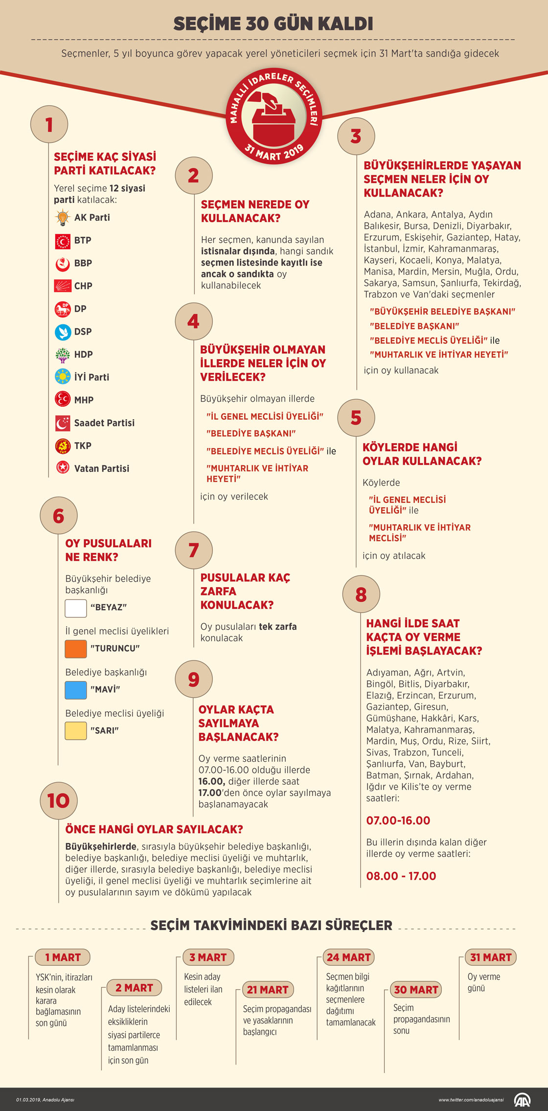 Seçmenler, 5 yıl boyunca görev yapacak yerel yöneticileri seçmek için 31 Mart'ta sandığa gidecek. Mahalli idareler seçimlerinde 57 milyon seçmen oy kullanacak, seçimlerde 12 siyasi parti yarışacak. (Gözde Gültekinler-Anadolu Ajansı)
