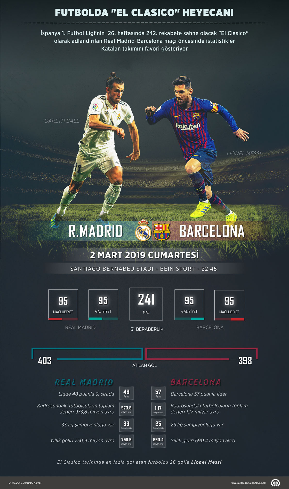 İspanya 1. Futbol Ligi'nin (La Liga) 26. haftasında 242. rekabete sahne olacak, "El Clasico" olarak adlandırılan Real Madrid-Barcelona maçı öncesinde istatistikler Katalan takımını favori gösteriyor. (Muhabiri Muhammed Ali Yiğit-Anadolu Ajansı)